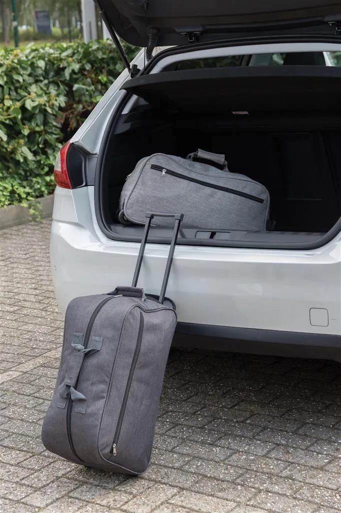 Vikend torba s kotačićima napravljena od dvobojnog 600D poliestera izuzetno jake i visoke gustoće. S proširivim sustavom kolica. Jedan prednji džep i jedan glavni pretinac s patentnim zatvaračem.