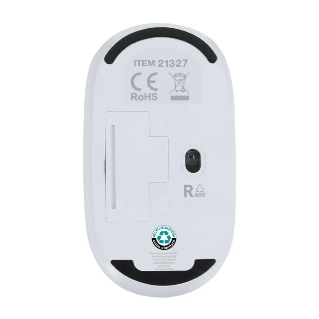 Bežični, optički računalni miš. USB priključak uključen. Sadrži ikonu recikliranog aluminija na proizvodu. Izrađen od RABS-a i recikliranog aluminija. U skladu s certifikatom GRS (Global Recycled Standard).