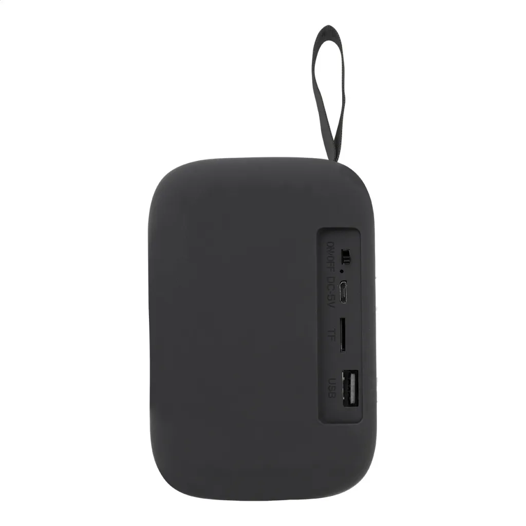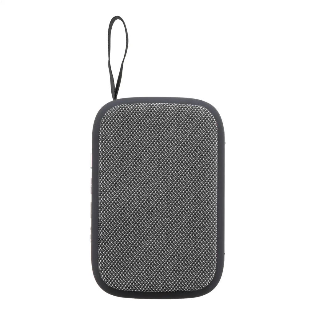Bluetooth zvučnik u plastičnom kućištu presvučenim poliesterskom tkaninom i ugrađenom punjivom baterijom (250 mAh). Uključuje USB kabel za punjenje.