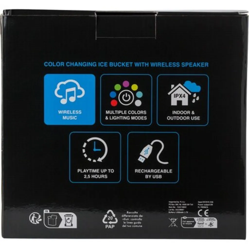 Bežični zvučnik s funkcijom posude za led sa svjetlima koja mijenjaju boju na dnu. Baterija od 1200 mAh.