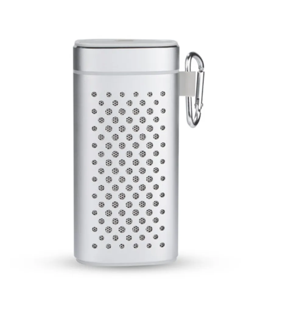 Elegantni bežični zvučnik s prijenosnom baterijom od 4000 mAh izvrstan je poklon za ljubitelje gadgeta. Napravljen je od metala što ga čini izdržljivim i na njemu će dobro izgledati urezani logo. Zvučnik se može koristiti kao hands-free set. Glazba se može reproducirati putem Bluetooth-a (Verzija 4.2), audio kabela s 3,5 mm priključkom (nije uključen) ili micro SD kartice. Uz to, nudi IPX4 vodootpornu klasu, tj. Potpunu zaštitu od prskanja i prskanja vodom iz raznih smjerova, s intenzitetom do 10 litara u minuti. Idealan je za turiste i u svakodnevnoj upotrebi npr. pod laganom kišom. Proizvod je u skladu s relevantnim direktivama Europske unije, ima oznaku CE i jednogodišnje jamstvo. Uključen mikro USB kabel za punjenje i karabin.