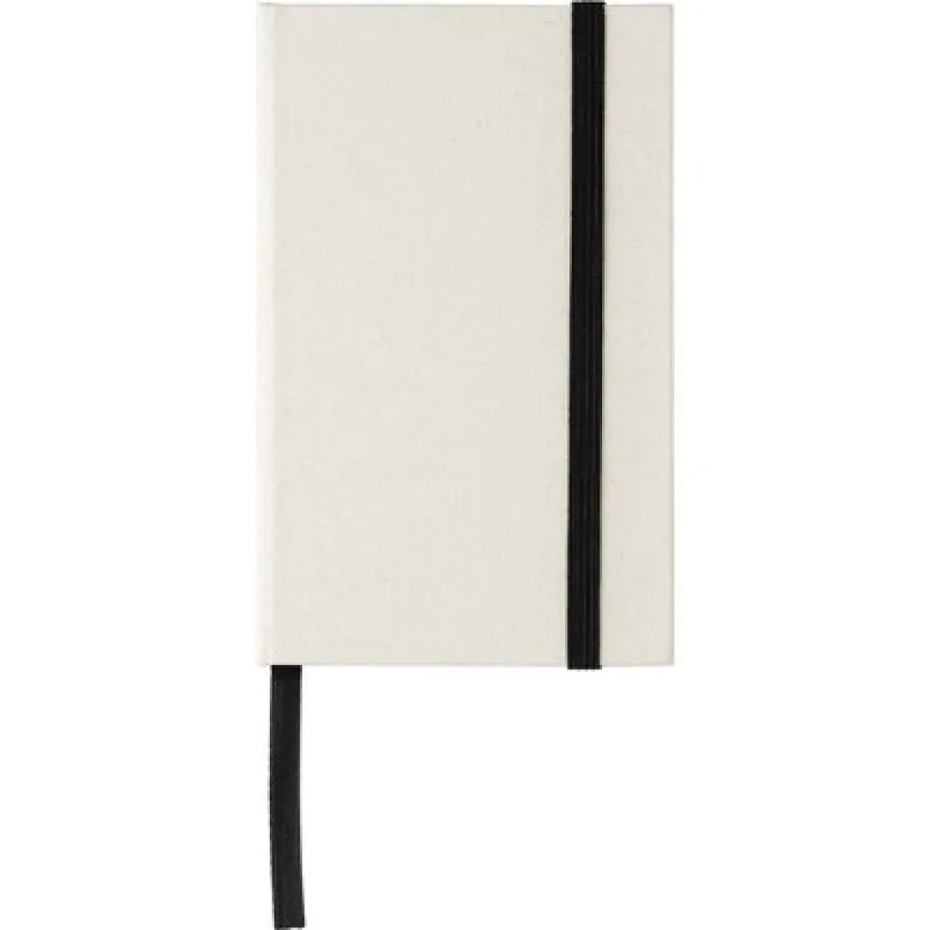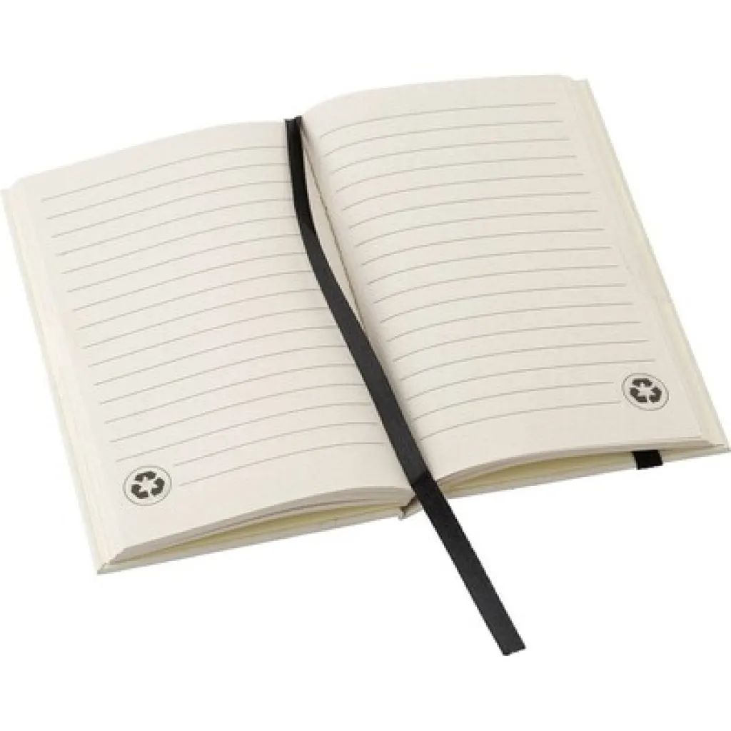 Bilježnica A6 od recikliranih tetrapaka za mlijeko, 80 listova, elastična traka i vrpca.
