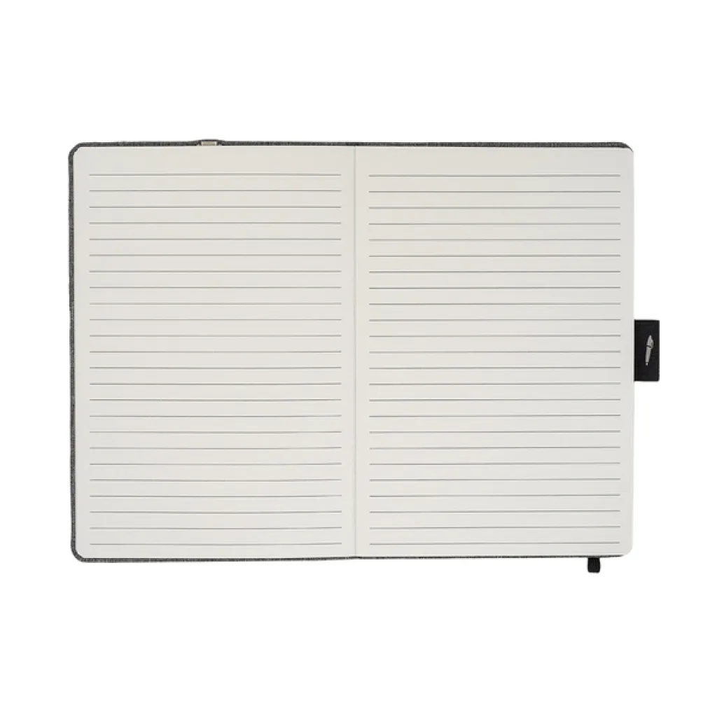 A5 bilježnica tvrdih korica s ugrađenim bežičnim punjačem (15W). Izrađena od poliestera. Sadrži 80 listova na kockice, 70 gm2. USB kabel uključen.