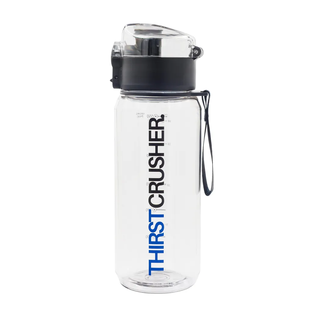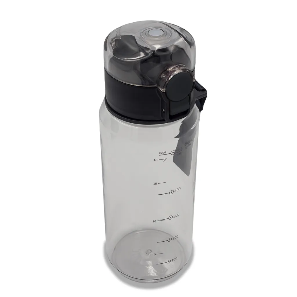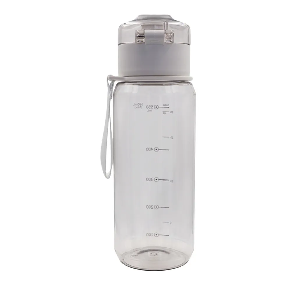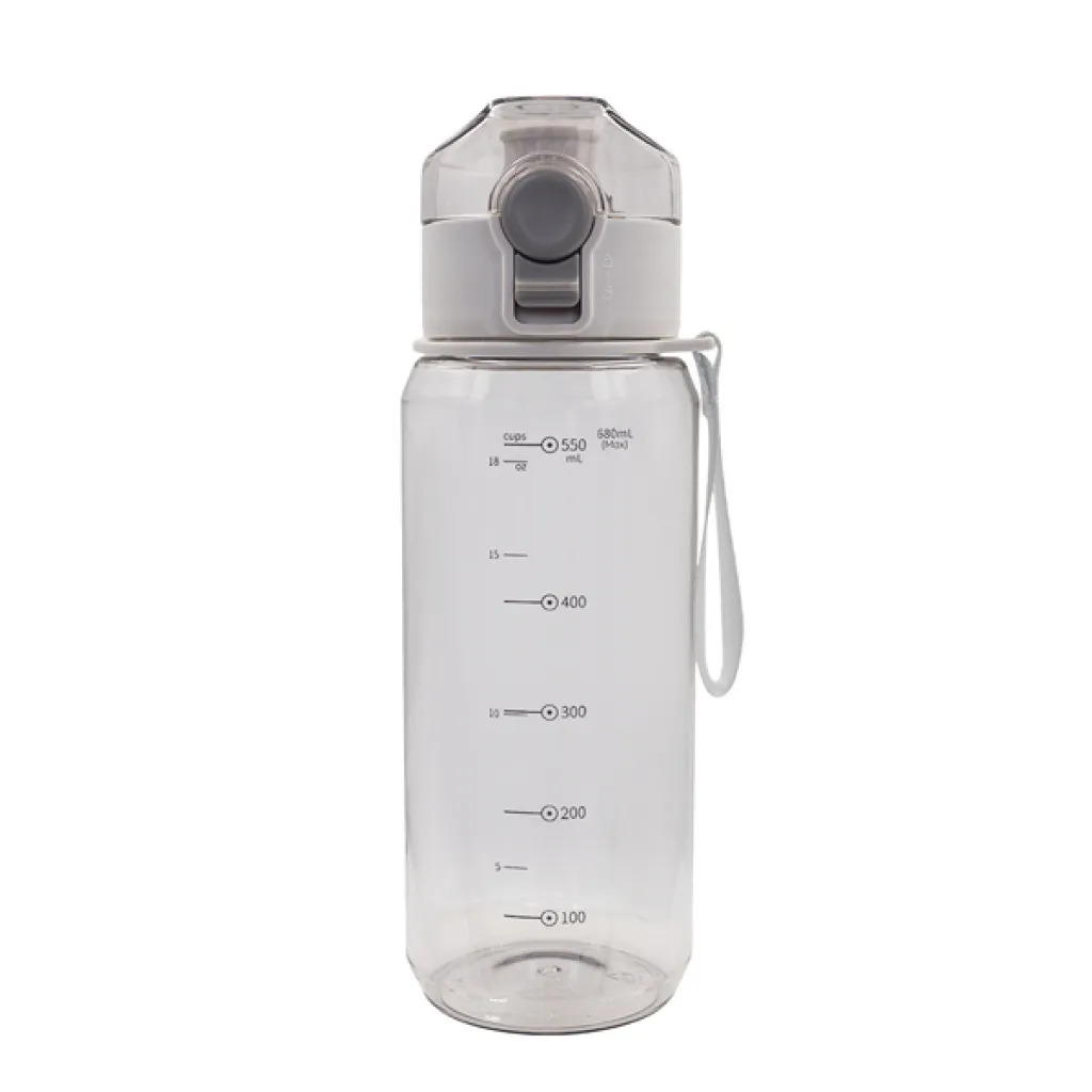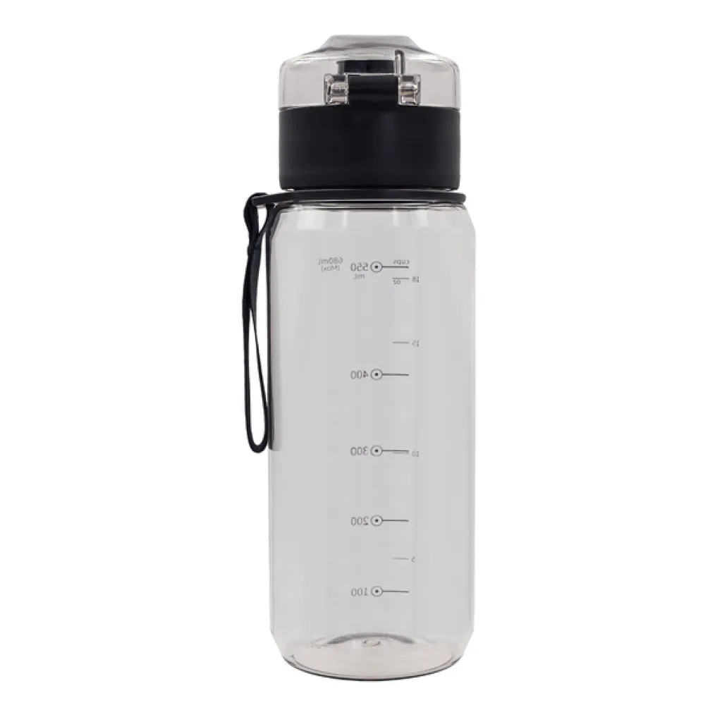 Hermetički zatvorena tritan boca za vodu zapremnine 680 ml. Boca ima mjerač volumena, vezicu za nošenje te dvostruki sigurnosni sustav koji sprječava izlijevanje tekućine — gumb i klizno zaključavanje.