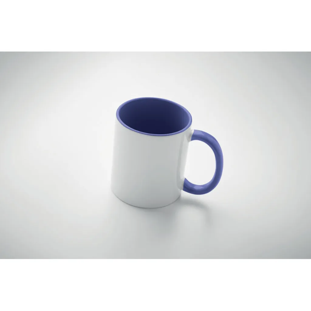 Keramička šalica zapremine 300 ml s posebnim premazom za sublimaciju s obojenom ručkom i unutrašnjosti. Pojedinačno pakiranje u bijeloj kartonskoj kutiji.
