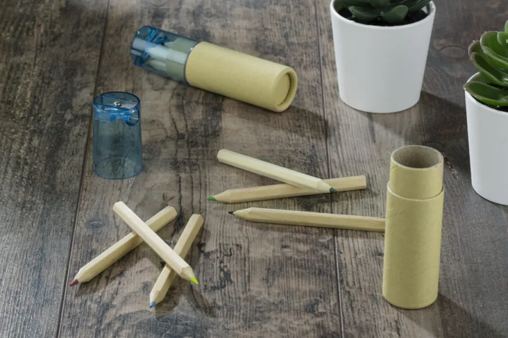 Set od 6 drvenih bojica u papirnatoj tubi sa šiljilom. Mogućnost dotiska loga na tubu.