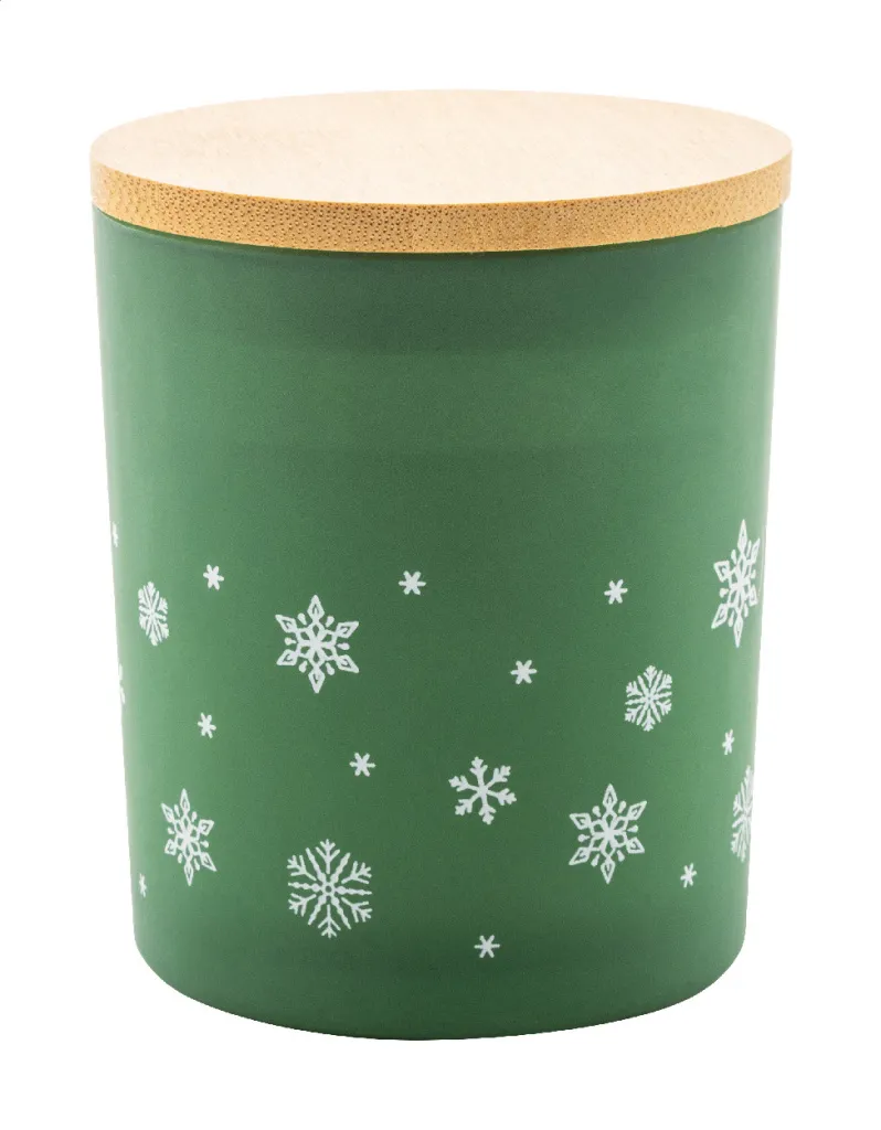 Mirisna svijeća od biljnog voska u posudici od matiranog stakla s božićnim ukrasom u obliku pahuljice i poklopcem od bambusa. Miris vanilije. 120 grama. Pakirano u kutiji od kraft papira.