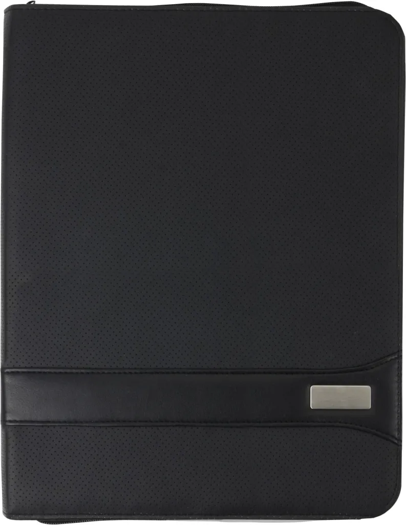 PVC konferencijska mapa s patentnim zatvaračem (približno A4 format) s blokom od 30 stranica na crte, dva velika unutrašnja džepa, četiri mala džepa veličine kreditne kartice i držačem za olovku (olovka nije uključena).
