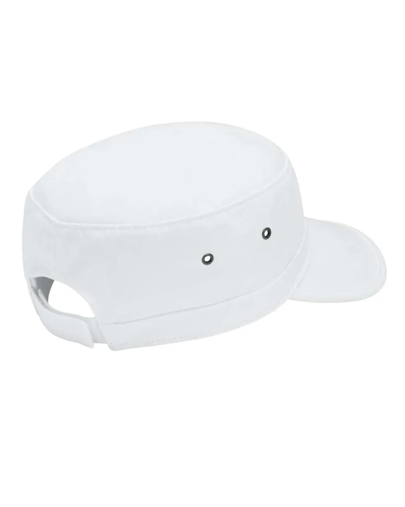 100% pamuk. Nestrukturirana kruna ravnog vrha. Prethodno zakrivljen šilt s uvezom od iste tkanine. Dvije ušice od antiknog mesinga sa svake strane. Zatvaranje pomoću čičak trake.