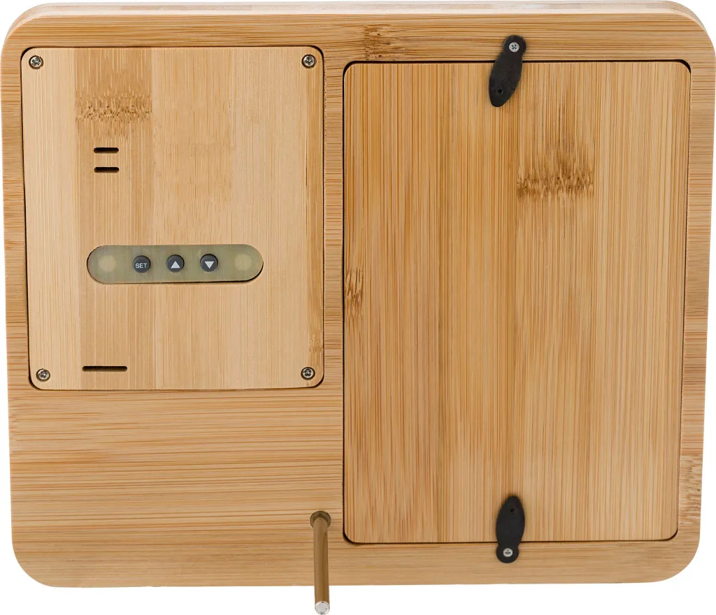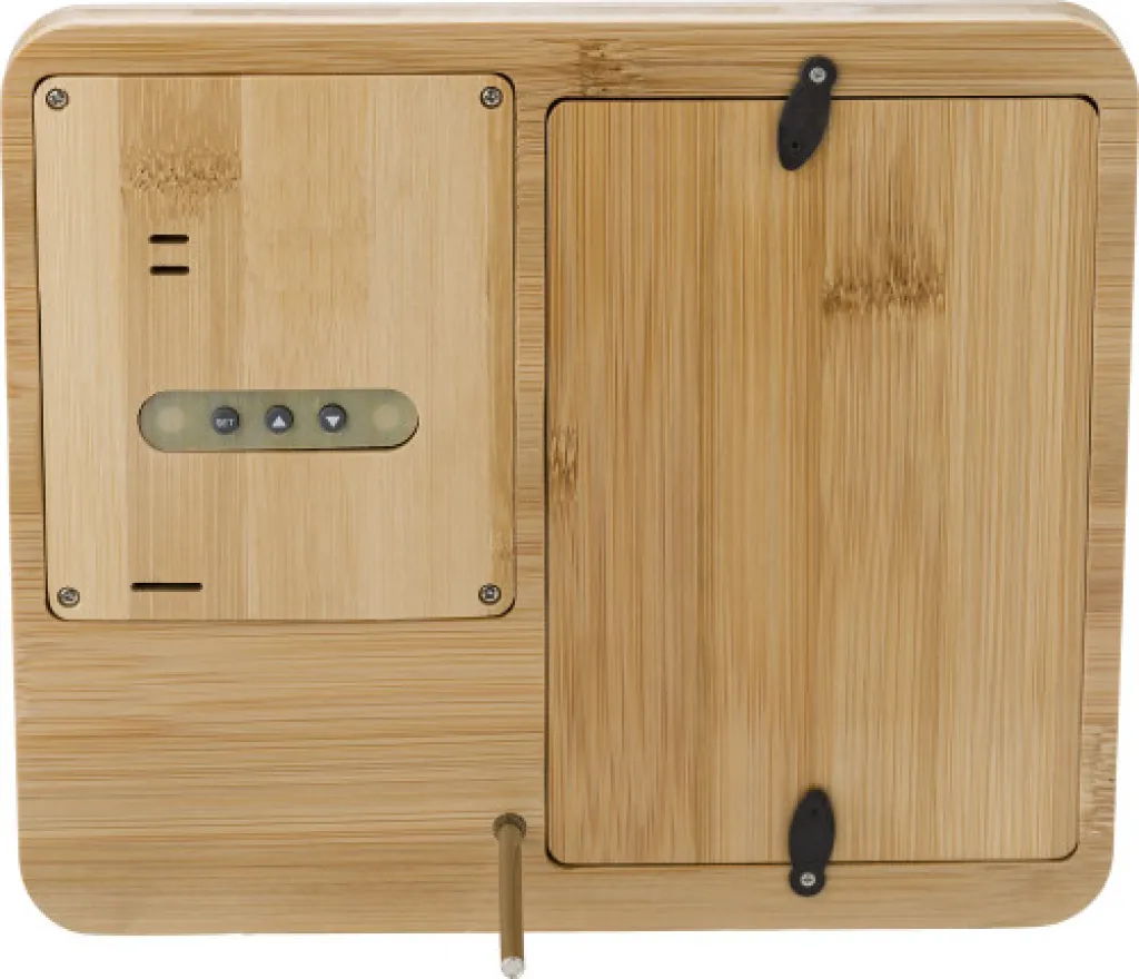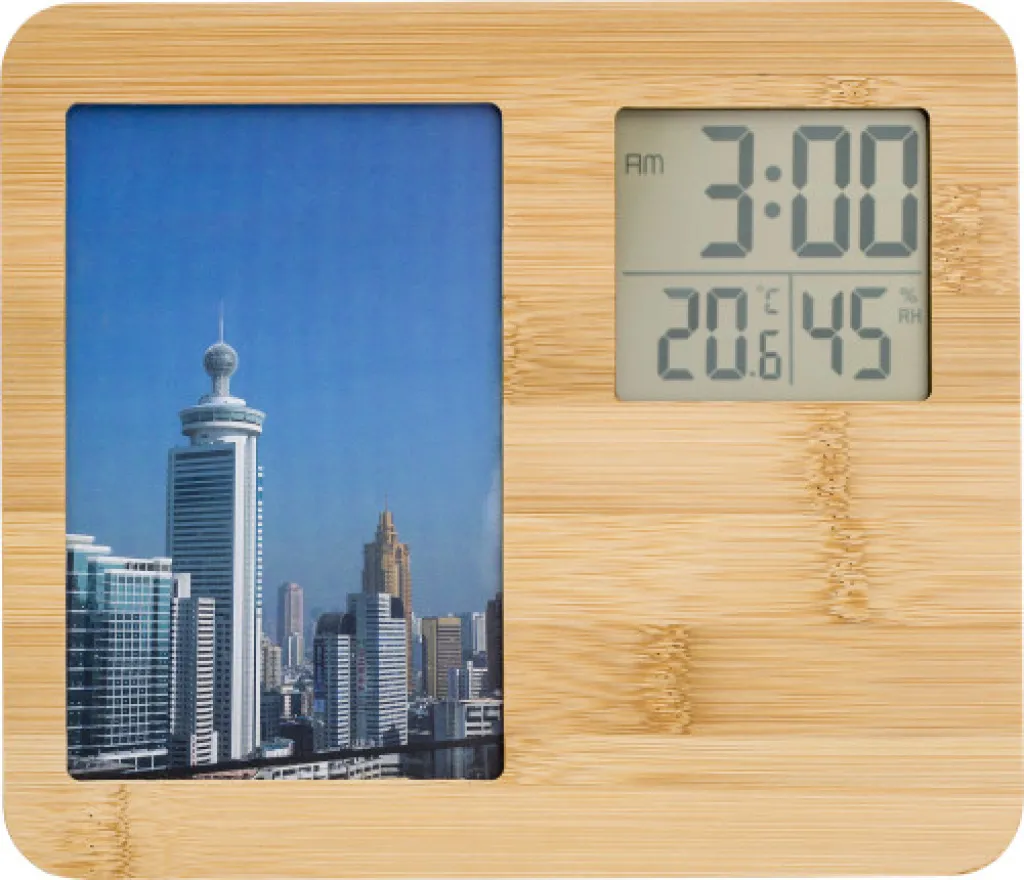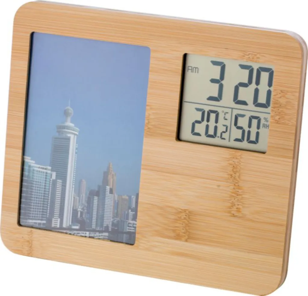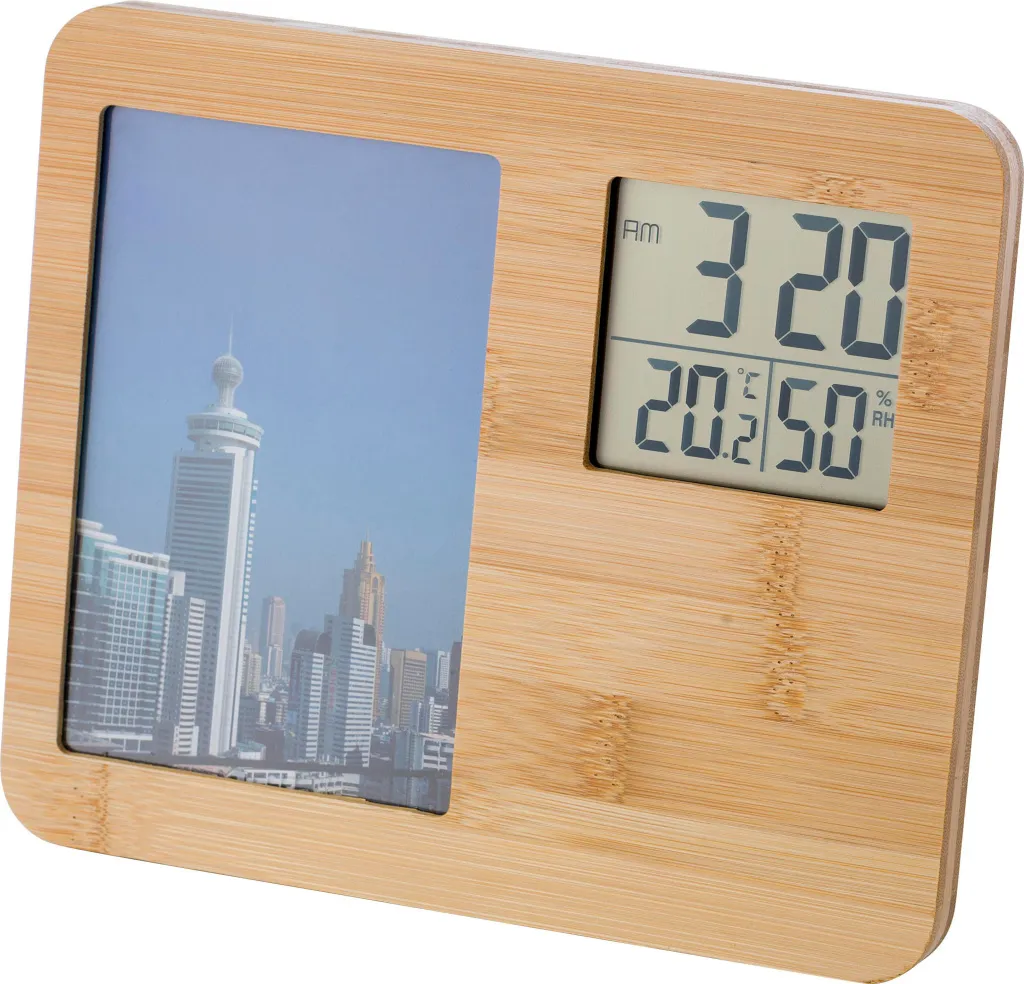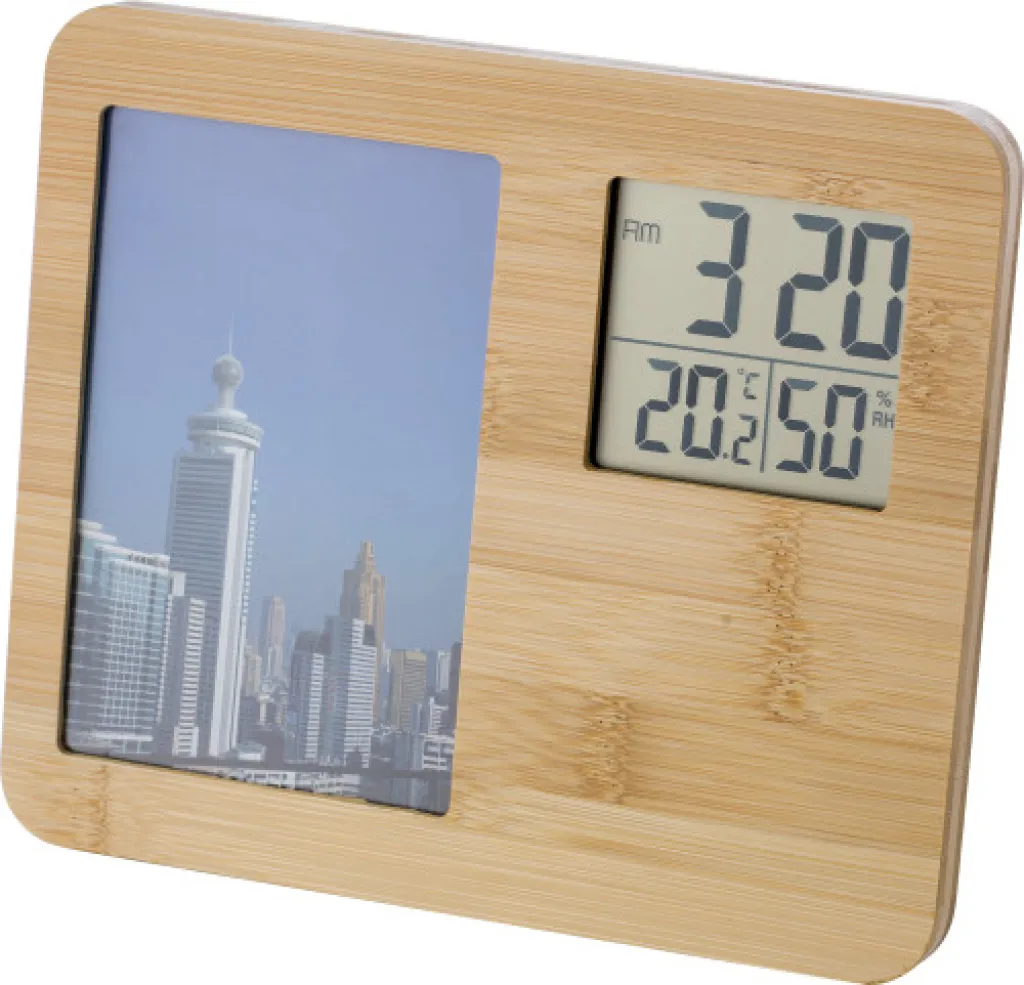 Meteorološka stanica od bambusa s okvirom za fotografije. Funkcije: sat, temperatura i vlažnost. Veličina prostora za fotografije 15 x 10 cm. Baterije uključene.