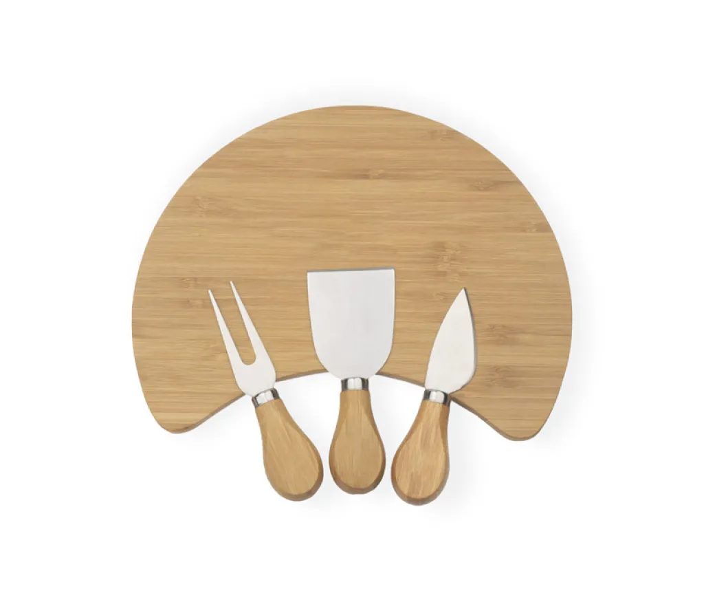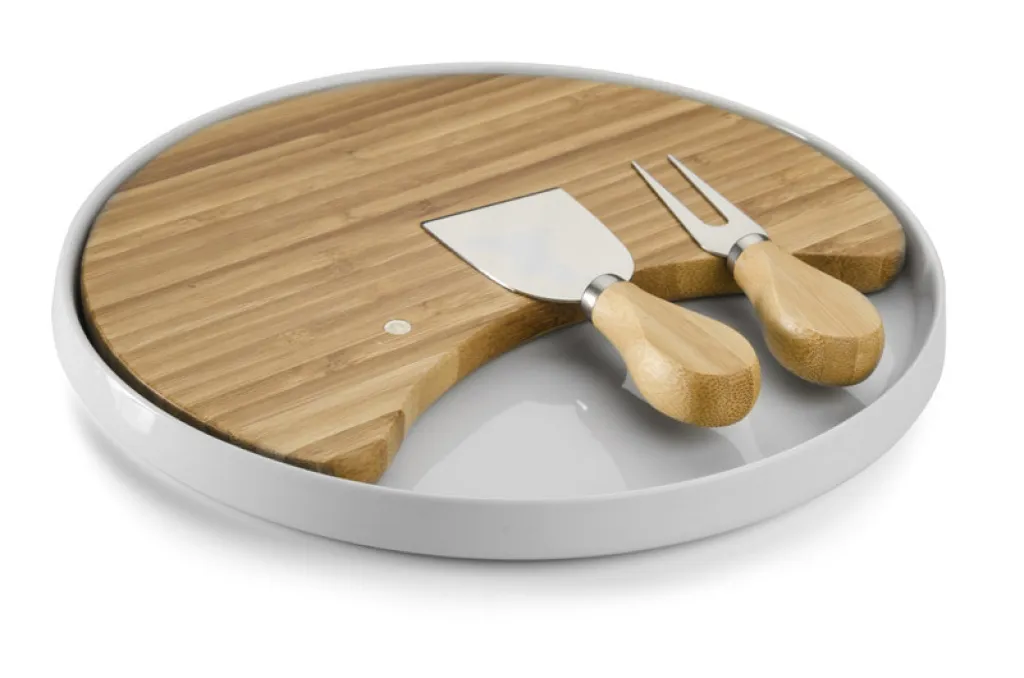 Daska za rezanje sira je elegantan set za posluživanje sira. Set je neophodan za druženja uz čašu vina. Sadrži dasku od bambusa, keramičko postolje i tri noža.
