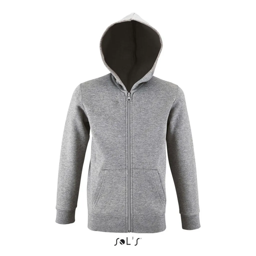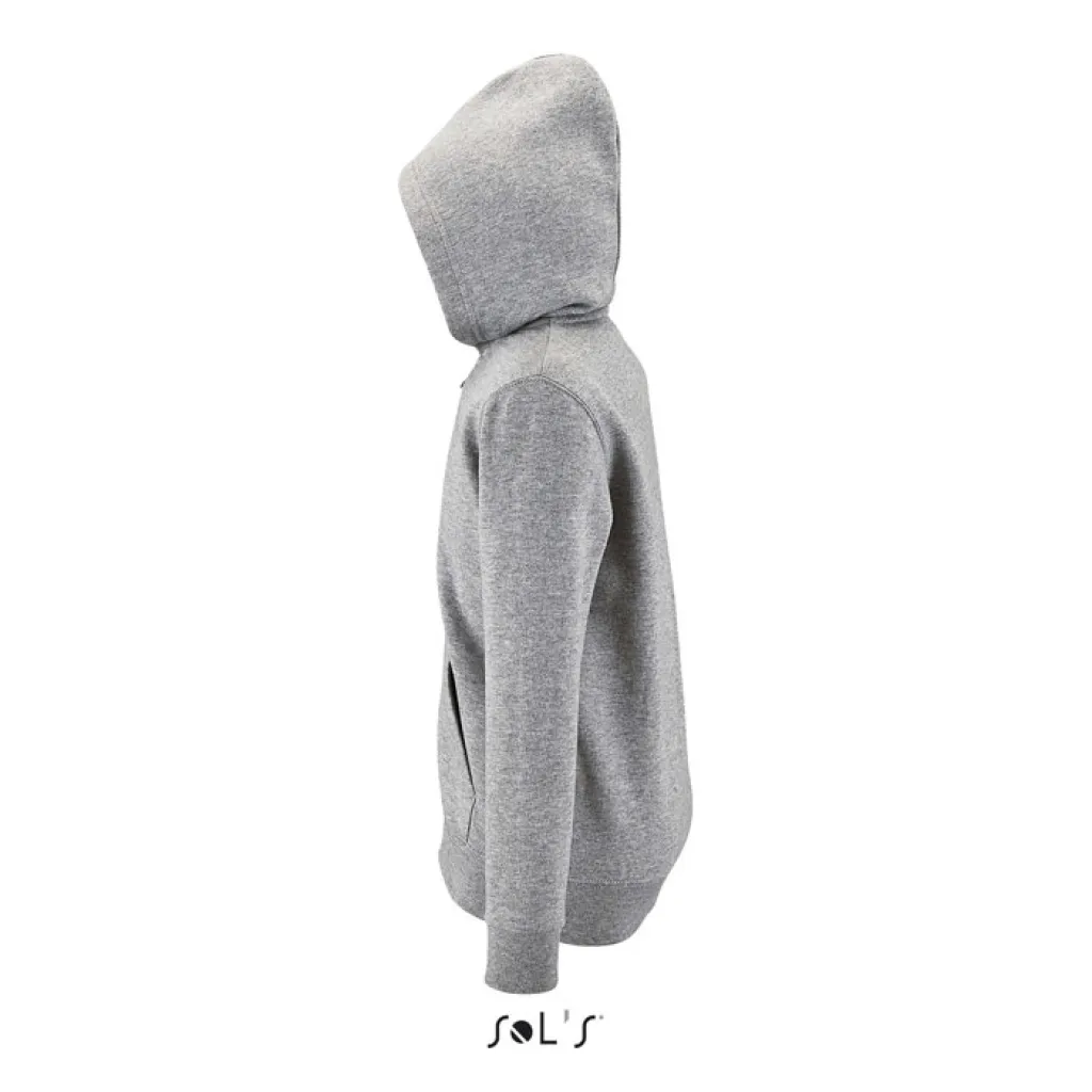 SOL'S STONE dječja hudica s patentom, prednjim "kangaroo" džepom, rebrastim mažetama i šavovima. Bez etikete. Specifikacije: 260g/m², izbrušena iznutra, 50% pamuk, 50% poliester. OEKO-TEX. Sizes 6 godina: 106-116cm, 8 godina: 118-128cm, 10 godina: 130-140cm, 12 godina: 142-152cm.