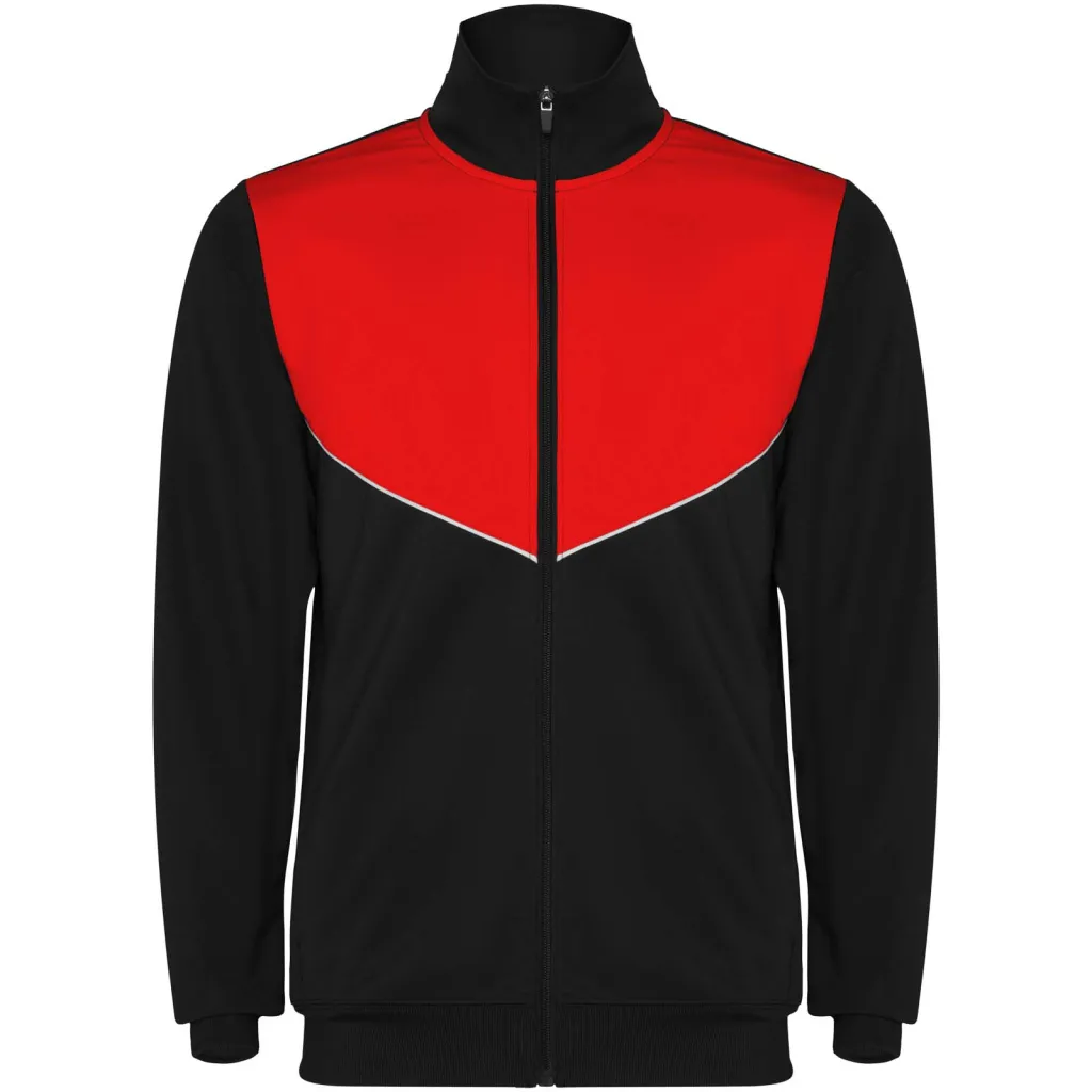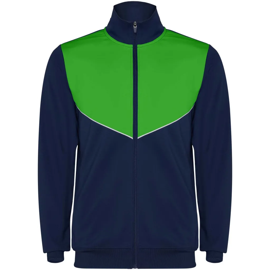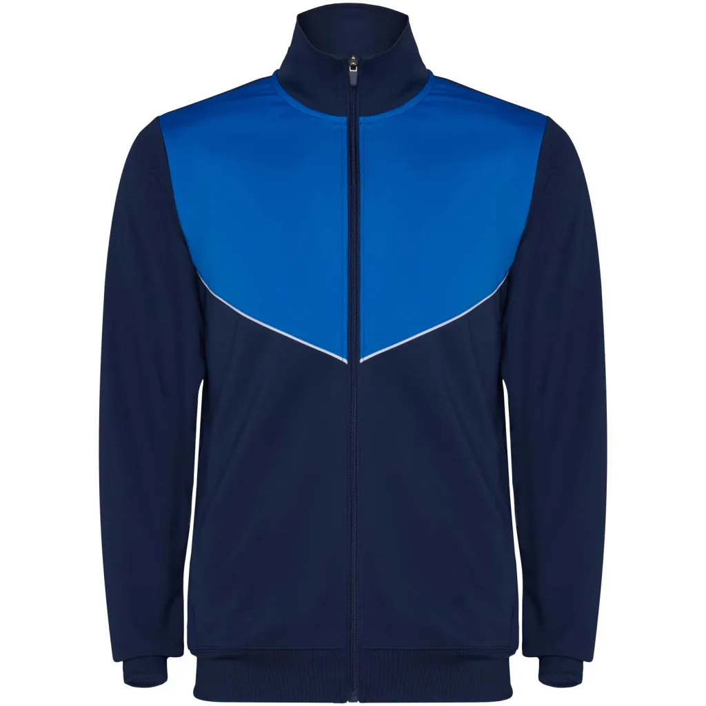 Trenirka od lagane i elastične tkanine. Jakna s kontrastnom bojom i ukrasnim šavovima na prsima. Visoki ovratnik s kontrastnim šavovima. Središnji patentni zatvarač sprijeda. Bočni džepovi. Rebraste manšete i pojas (2x2 rebra). Hlače s elastičnim pojasom i vezicom. Bočna kontrastna traka s ukrasnim šavom. Donji rub s patentnim zatvaračem.