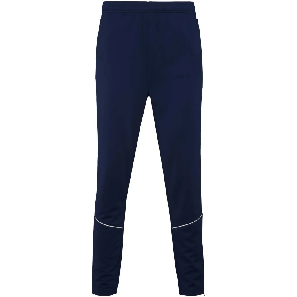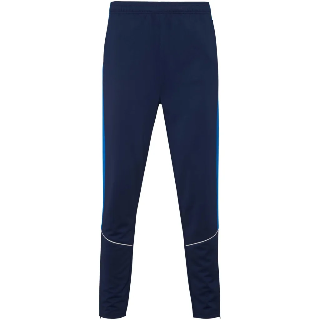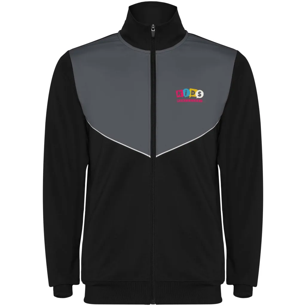 Trenirka od lagane i elastične tkanine. Jakna s kontrastnom bojom i ukrasnim šavovima na prsima. Visoki ovratnik s kontrastnim šavovima. Središnji patentni zatvarač sprijeda. Bočni džepovi. Rebraste manšete i pojas (2x2 rebra). Hlače s elastičnim pojasom i vezicom. Bočna kontrastna traka s ukrasnim šavom. Donji rub s patentnim zatvaračem.