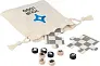 Drvena igra šaha i dame u pamučnoj torbici s vezicom. Uključuje tiskanu slagalicu od 6 dijelova (crno/prirodno igralište) za sastavljanje ploča za igru i 16 tiskanih drvenih žetona s dizajnom igrača šaha. Drveni čipovi dolaze u prirodnoj i crnoj boji. Uključuje upute za igranje i etiketu unutar vrećice. Ploča za igru je izrađena od imitacije drva, a žetoni su od borovine.