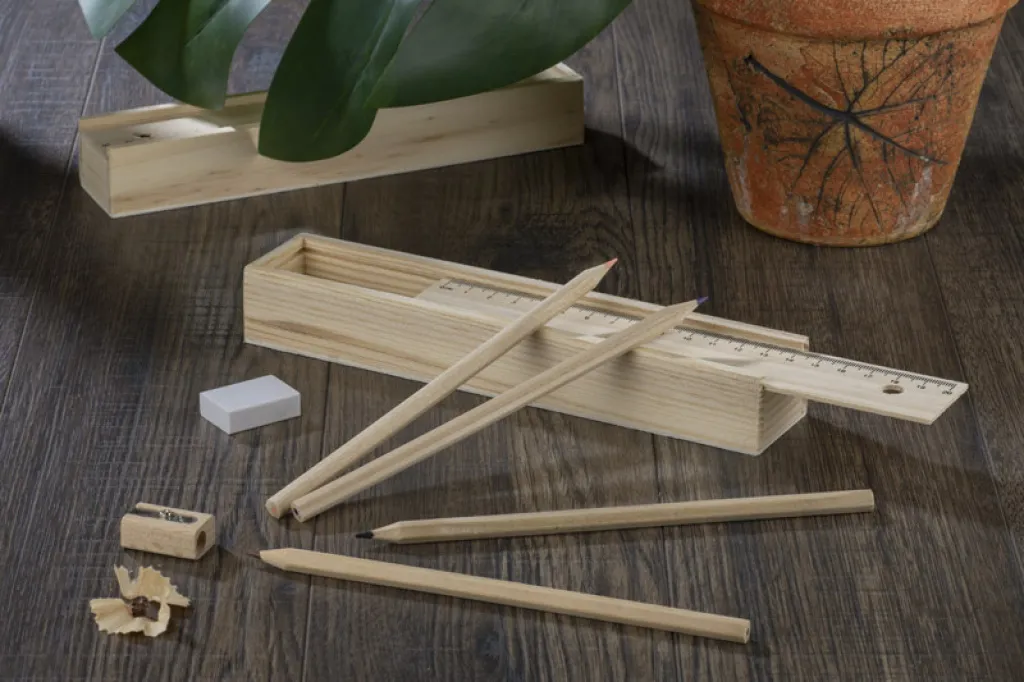 Drvena pernica opremljena s 12 drvenih bojica, ravnalom i gumicom. Preporuka za dotisak: graviranje na kutiju.