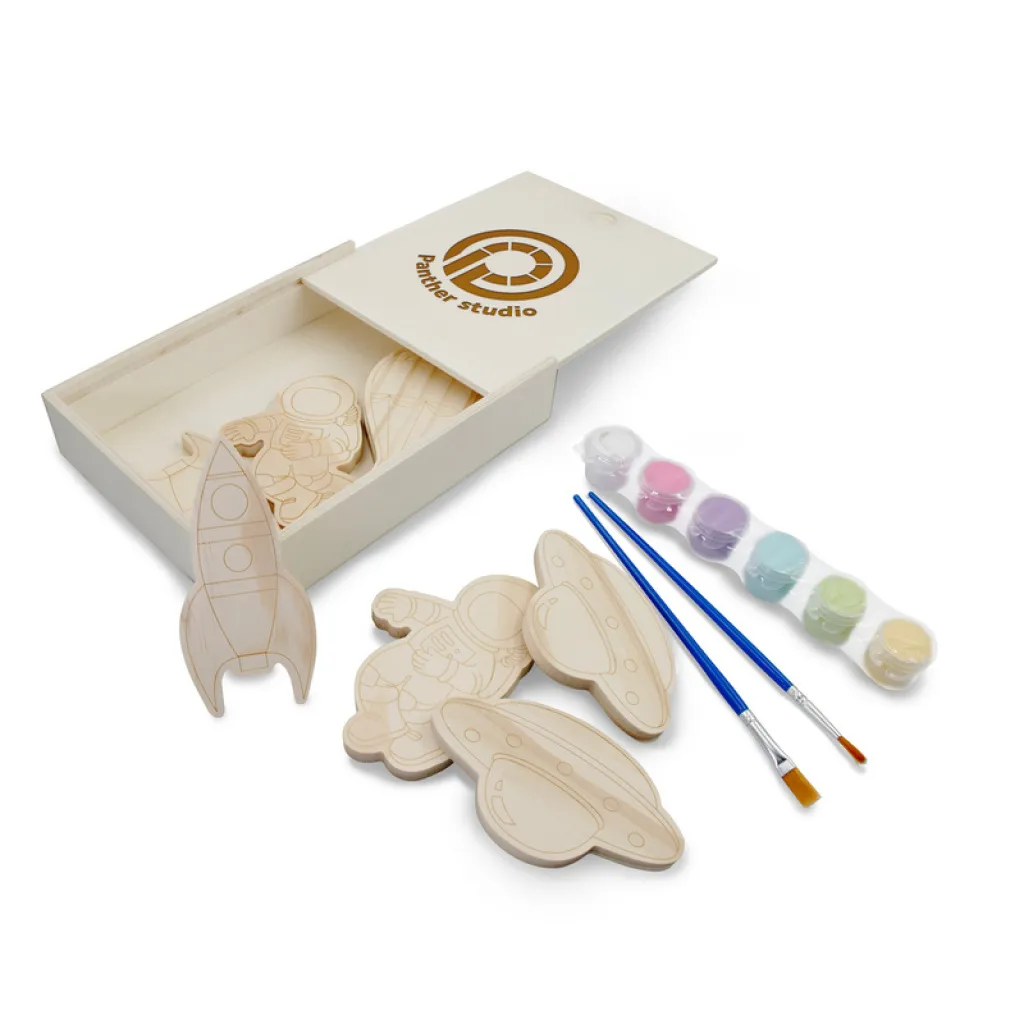Set od osam drvenih figura za bojanje. Kreativna i zabavna aktivnost. Uključuje šest boja i dva kista.