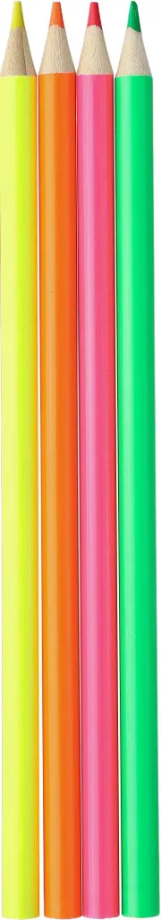 Set drvenih markera s 4 olovke u neonskoj boji (žuta, narančasta, roza i zelena) u papirnatoj kutiji.