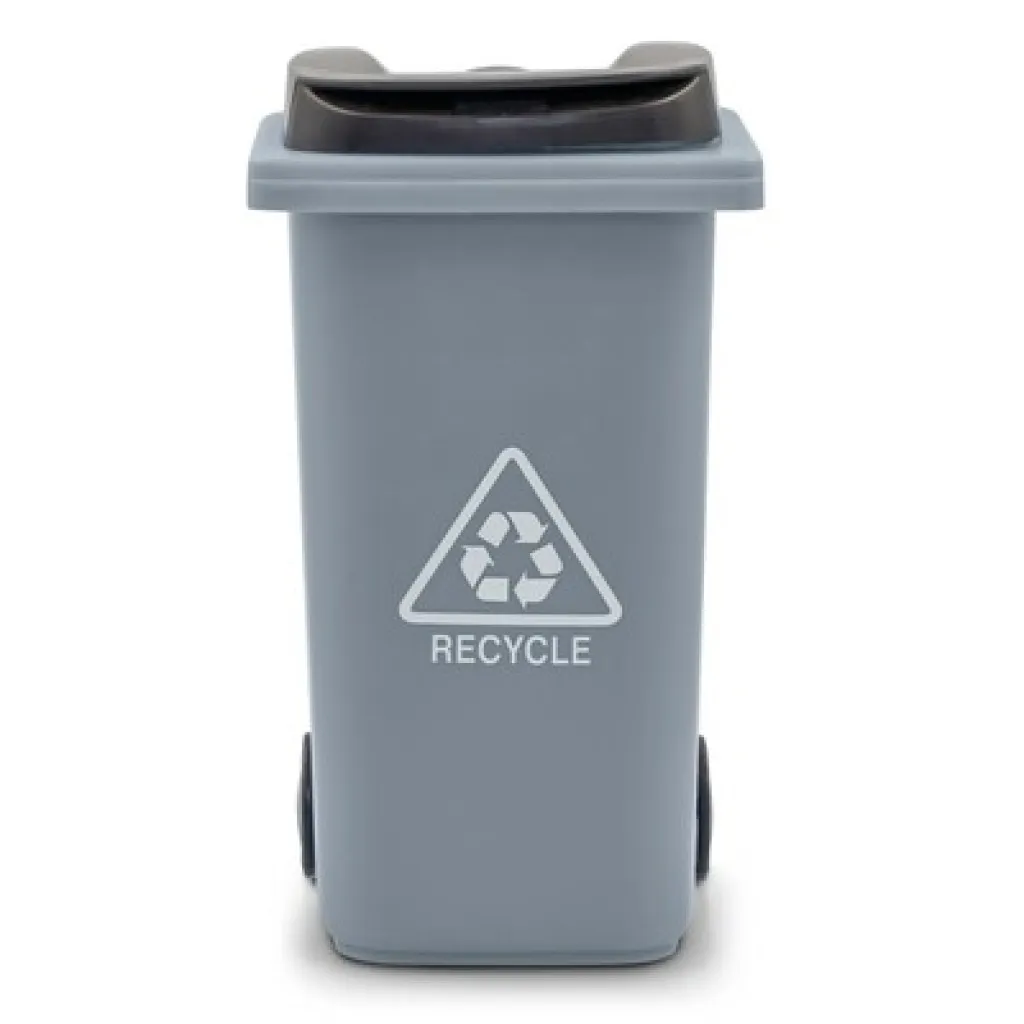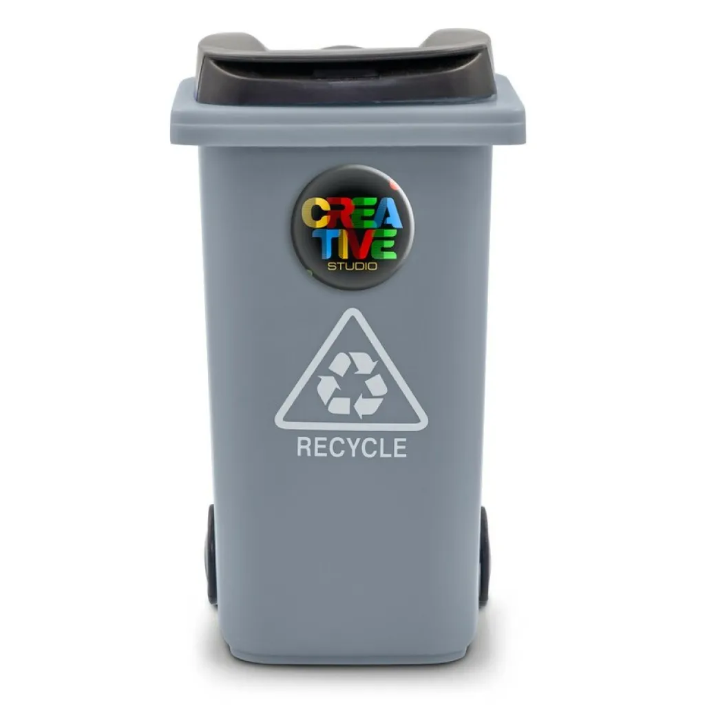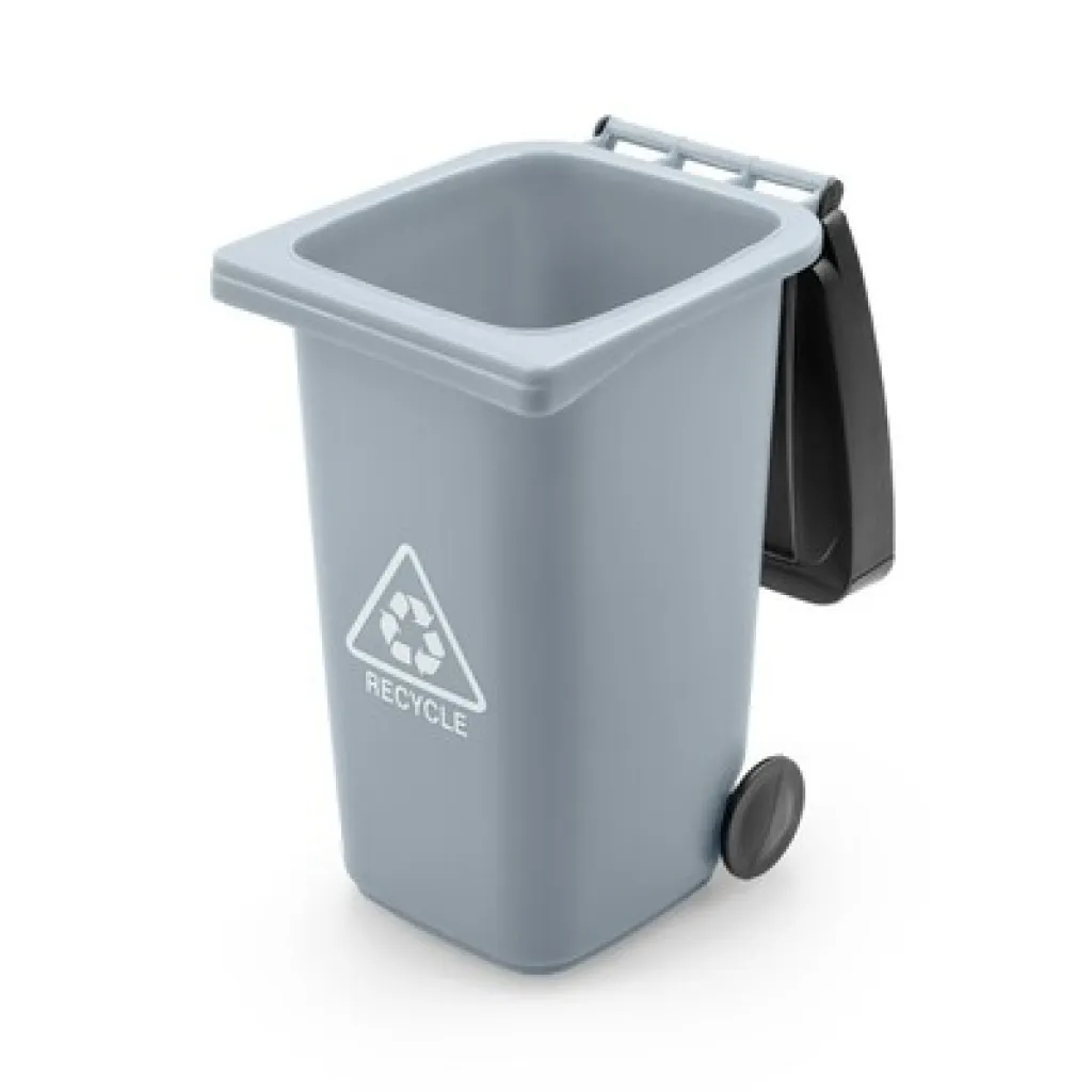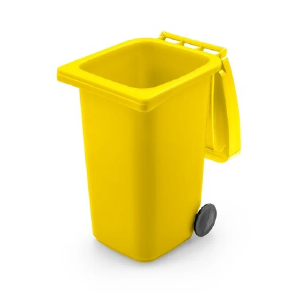 Držač za olovke s kotačićima u obliku kante za smeće, s poklopcem i mat završnom obradom, proizvod izrađen od PP-a.
