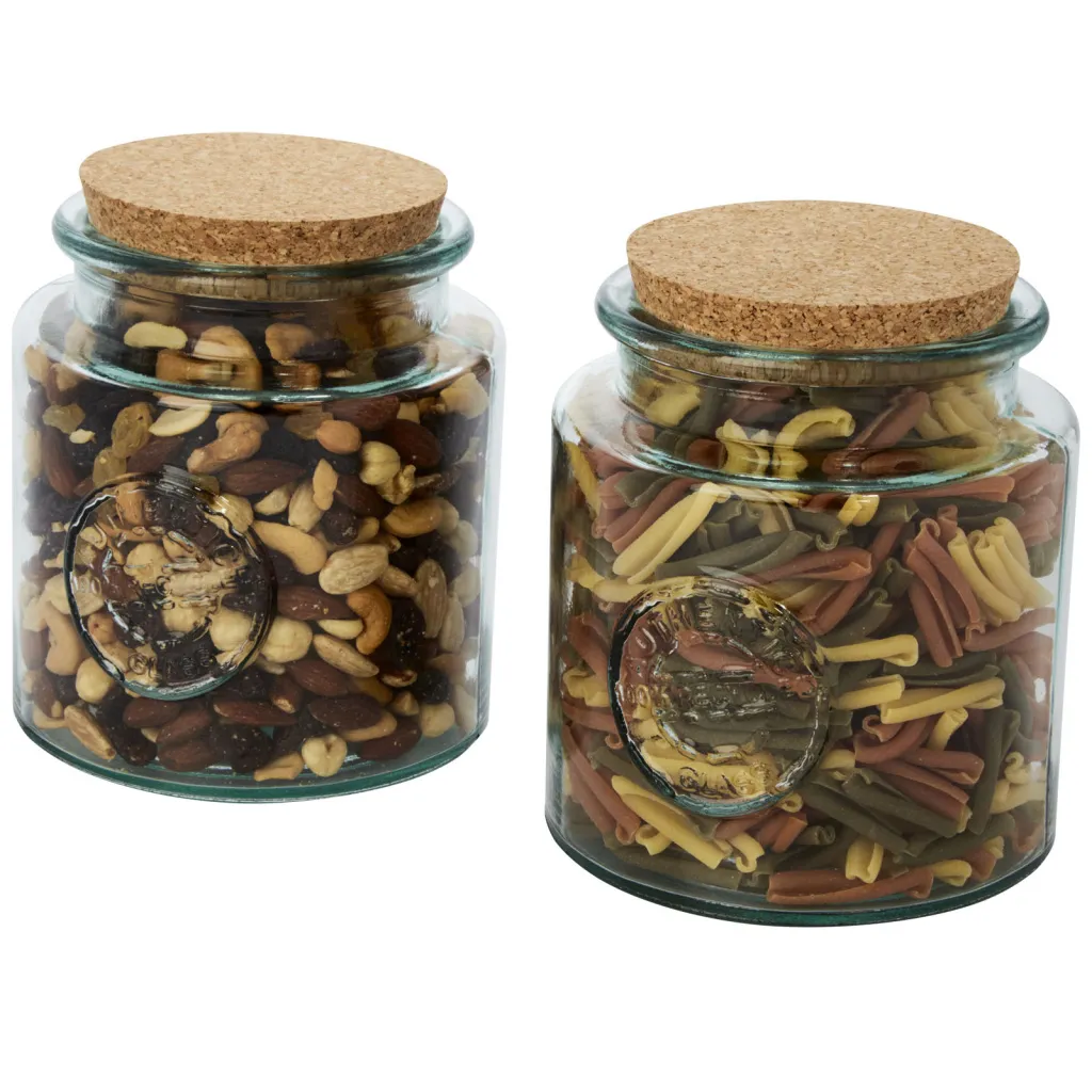 Dvodijelni set od recikliranog stakla s dva spremnika za suhu hranu od 1500 ml s poklopcem od pluta. Izrađeno od 3 staklene boce. Reciklirano staklo proizvodi se s manje energije, sirovina i aditiva nego što je potrebno za izradu tradicionalnog stakla. Veličina spremnika: visina 15 cm, promjer 14 cm.