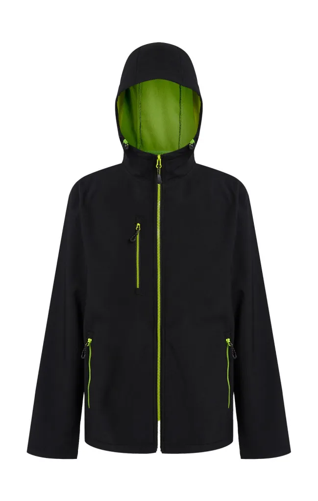 ·100% poliester (reciklirani) ·Softshell tkanina s mehaničkim rastezanjem ·Vanjska softshell tkanina pogodna za tisak, otporna na vjetar i vodu ·Topla podstava od flisa ·Neodvojiva kapuljača s podešivačina širine ·Ušiveni rukavi ·Potpuni patentni zatvarač u kontrastnoj boji ·Bočni džepovi s patentnim zatvaračem u kontrastnoj boji ·Džep na prsima s patentnim zatvaračem u kontrastnoj boji