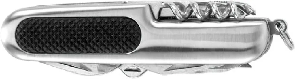 Džepni nož od nehrđajućeg čelika s 11 funkcija. Uključuje: otvarač za boce, otvarač za konzerve/odvijač s ravnom glavom, vadičep, odvijač s križnom glavom, dvije pile, par škara, dva mala noža, veliki nož i savijač žice.