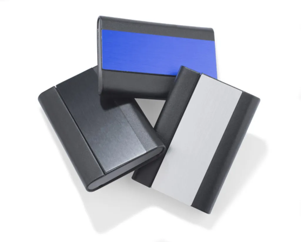 Elegantni držač za posjetnice izrađen od eko kože s širokom aluminijskom pločom u crnoj boji koja omogućuje lijepo graviranje logotipa.