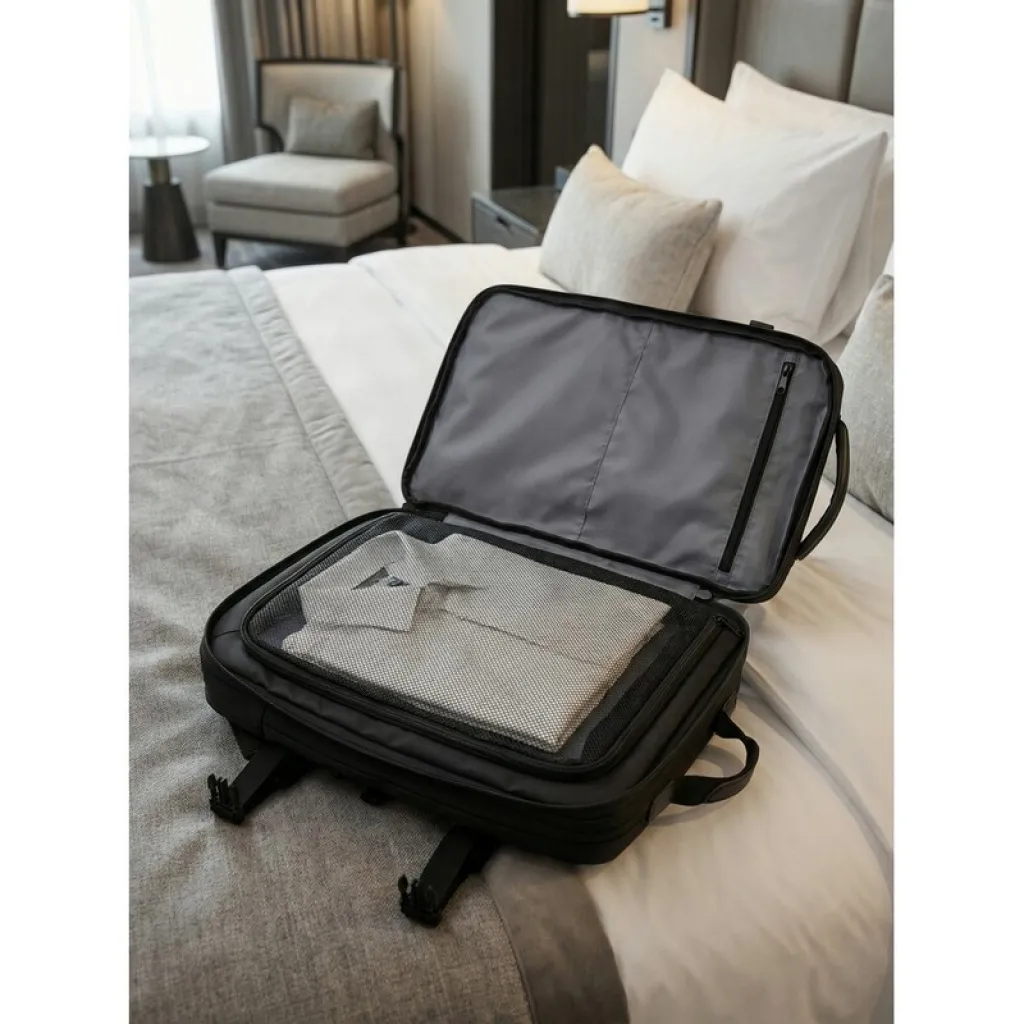 Exclusive Collection kabinska torba / ruksak s proširivim dizajnom koji omogućuje prilagodbu dimenzija prema zahtjevima prijevoza i potrebama putnika. Ima 2 glavna pretinca s patentnim zatvaračem, 2 podesive kompresijske trake za bolju stabilizaciju, podstavljeni stražnji dio za veću udobnost te podesive naramenice za prilagođavanje duljine prema individualnim preferencijama. Proizvod je izrađen od poliestera i PU materijala.