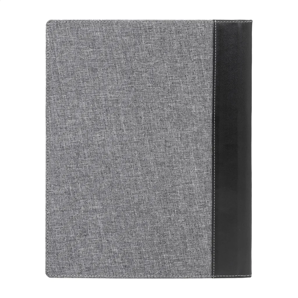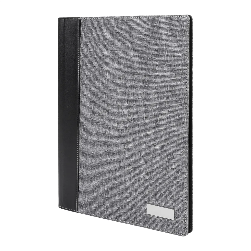 Fascikla A4 za dokumente od tkanine i umjetne kože, s blokom s 20 listova s crtama i metalnom pločicom.