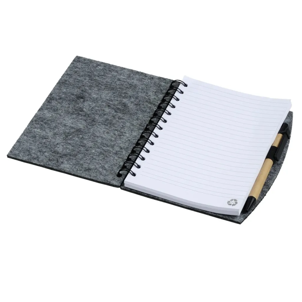 Spiralna bilježnica (70 g / m2, 160 stranica) s kutijom od filca s kemijskom olovkom od recikliranog kartona.