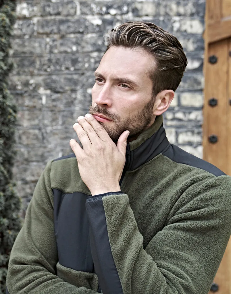 ·100% poliester (flis) ·Umetci: 92% poliester (Ripstop), 8% elastan ·Uspravni ovratnik ·Patentni zatvarač cijelom dužinom sa zaštitom protiv vjetra ·Džep na prsima s patentnim zatvaračem ·Elastični bočni paneli ·Prednji džepovi s patentnim zatvaračem ·Elastični obrub na manžetama ·Strukirano.