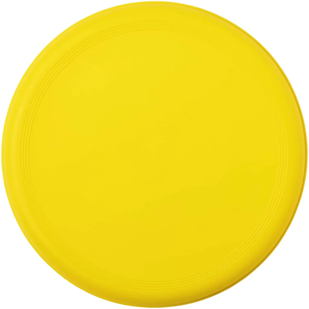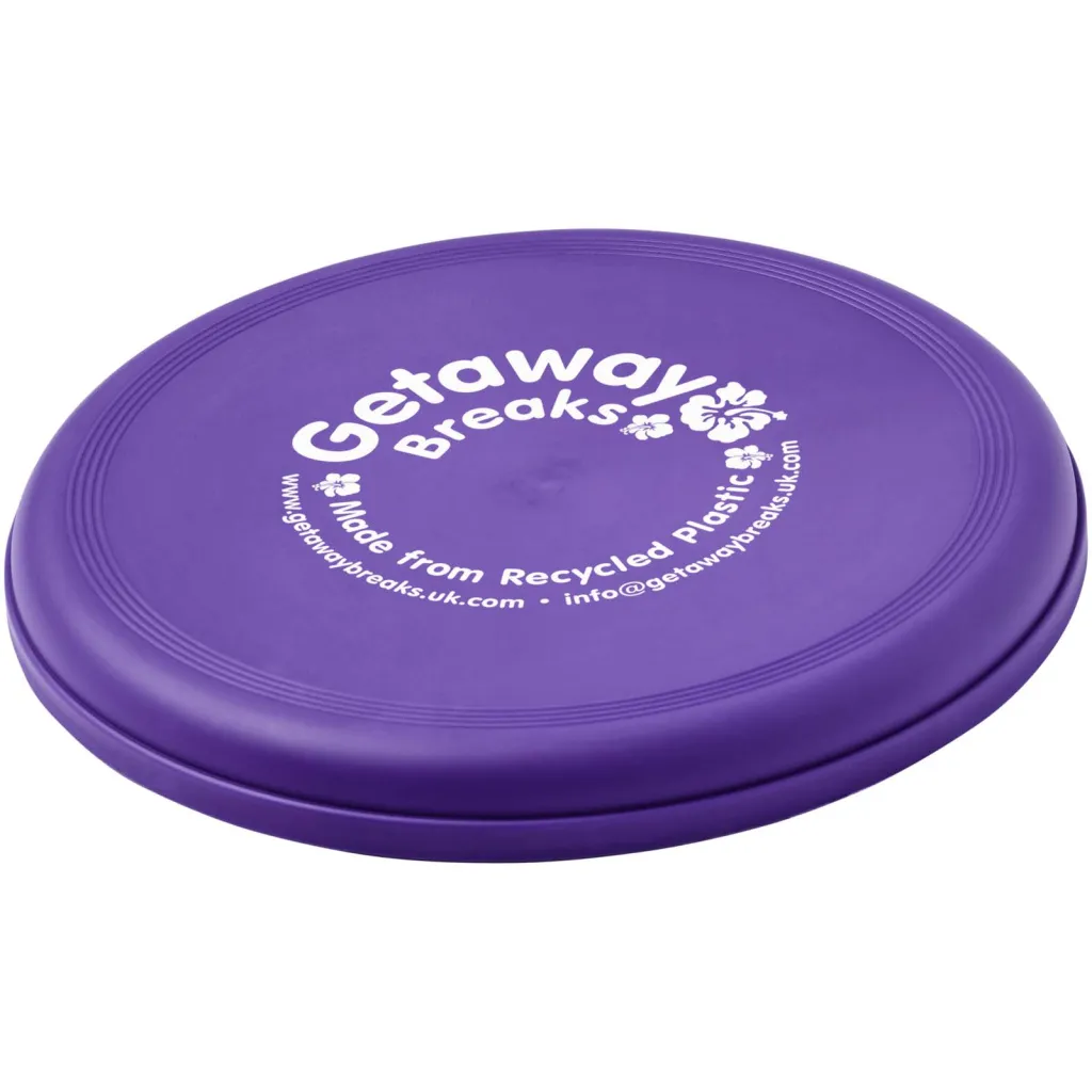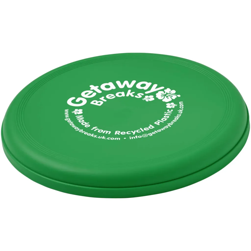 Frizbi izrađen od 100% reciklirane plastike, kombinirajući zabavnu promotivnu ideju sa snažnim održivim vjerodajnicama. Proizvedeno u Velikoj Britaniji i usklađeno s EN72. Frizbi može imati točkastu završnicu zbog prirode recikliranog materijala.