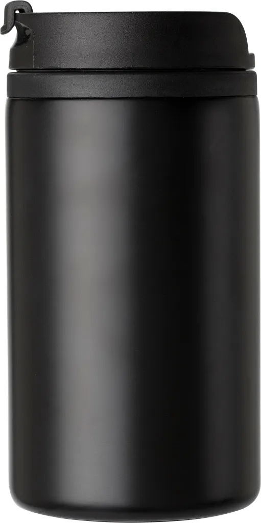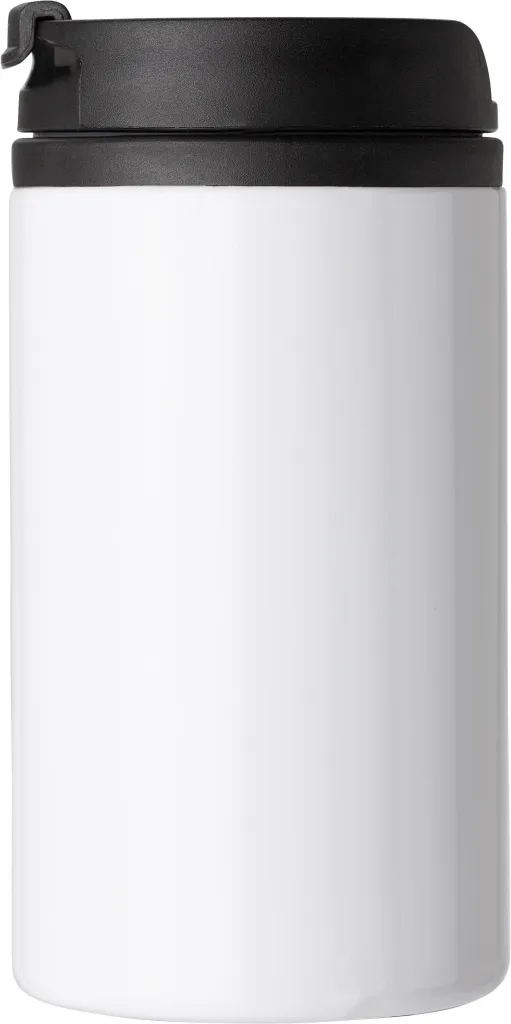 Termos šalica od nehrđajućeg čelika (300 ml), dvostrue stijenke. Vanjska stijenka je od nehrđajućeg čelika, unutarnja stijenka je plastična. Poklopac na navoj je nepropustan i ima otvor za piće s čepom. Dno šalice je protuklizno. Ne preporučamo lasersko graviranje na crvenu boju (008).