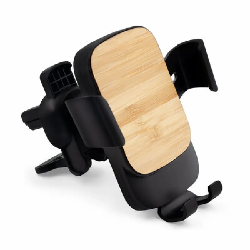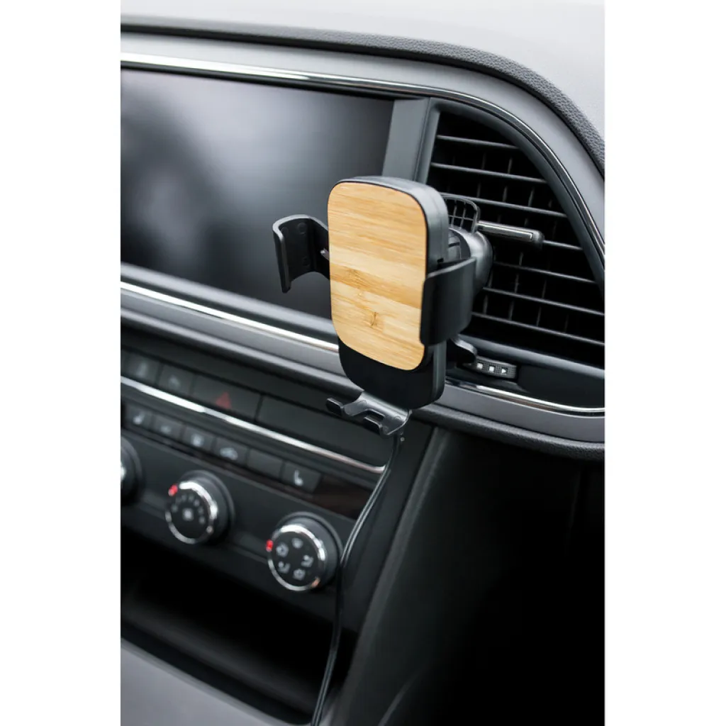 Gravity držač za mobitel za auto s elementom od bambusa. Bežični punjač 15W. Radi s uređajima s funkcijom induktivnog punjenja. Nosač za ventilacijski otvor. USB-C ulaz. USB-C kabel od 100cm uključen. Proizvod izrađen od ABS-a i bambusa.