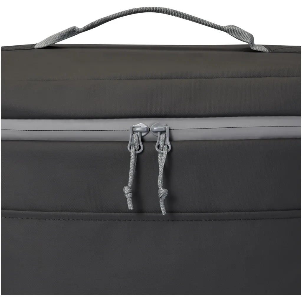 Vodootporna termo torba za 20 limenki izrađena od GRS certificiranih recikliranih materijala, uključujući patentne zatvarače. Sadrži prostrani pretinac s patentnim zatvaračem obložen toplinskom PEVA i pjenastom izolacijom visoke gustoće koja je sigurna za hranu i koja satima čuva napitke i osvježenja hladnima. Također ima dva mrežasta džepa i jedan otvoreni prednji džep za dodatnu pohranu. Ručka za nošenje od tkanine i podesiva i podstavljena naramenica čine ga udobnim za nošenje. GRS reciklirani materijali uključuju glavnu tkaninu, podstavu, tkaninu i patentne zatvarače. Kapacitet: 22 litre. Bez PVC-a.