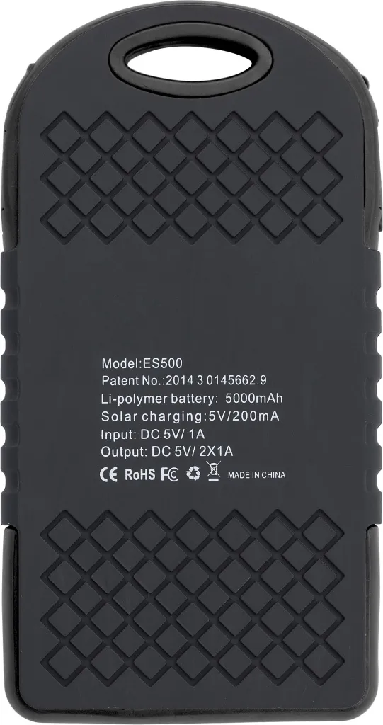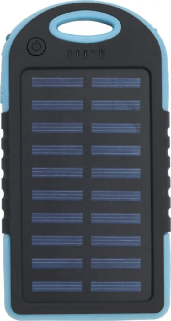 Gumirani ABS solarni powerbank sa zelenim indikatorima i svjetiljkom sa strane. Ima dva USB priključka i jedan Micro USB priključak. Solarno punjenje: 5V/200mA. Ulaz DC 5V/1A. Izlaz DC 5V/2x1A. Kapacitet: 4.000 mAh. Uključuje USB kabel.