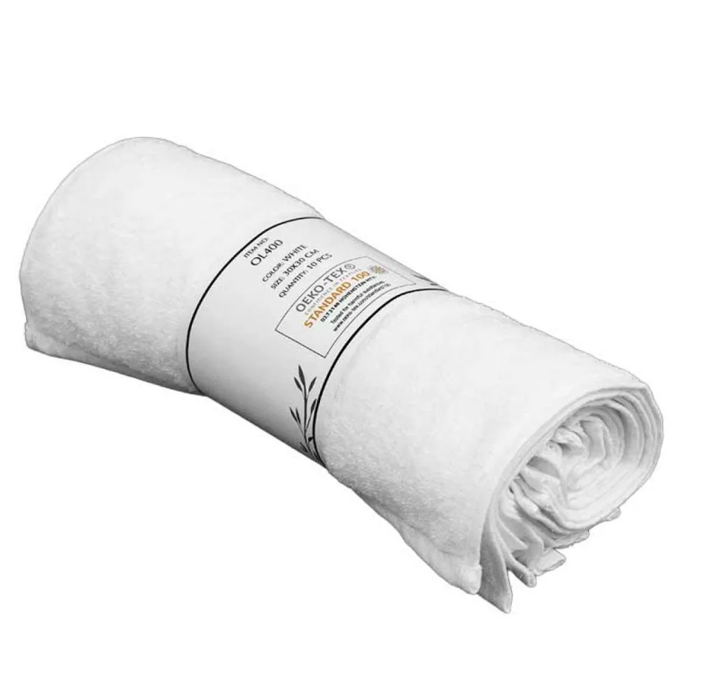 100% prstenasto tkani pamuk. 400 g/m². Otkine se etiketa. Papirnata traka na pakiranju od 10 kom. Dvostruki šavovi. Nema štetnih tvari! STANDARD 100 certificirano od strane OEKO-TEX®. Izbjegavajte upotrebu omekšivača jer smanjuje upijanje vode ručnicima.