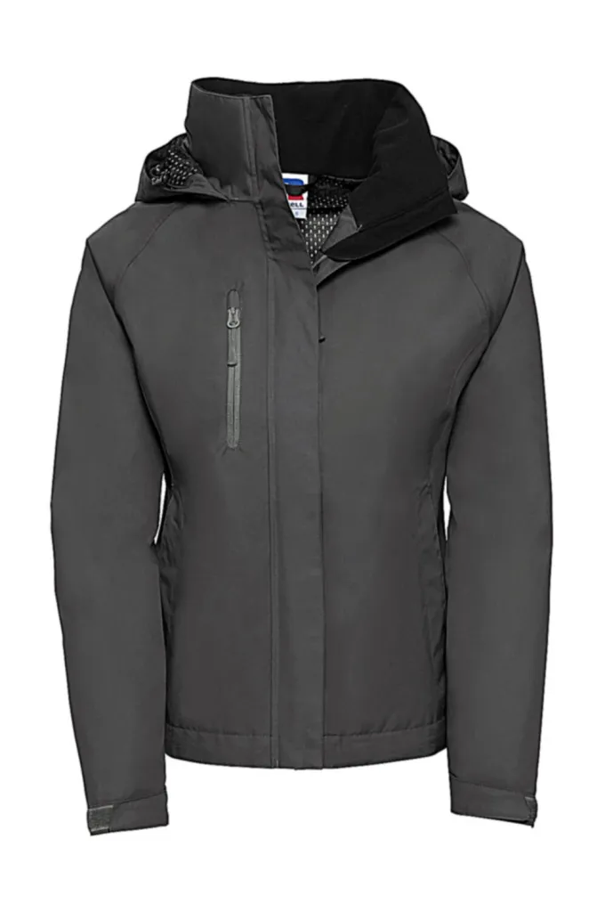 ·190 g/m² ·Vanjski sloj: 100% najlon (taslan) s PU premazom ·Unutarnji sloj: mrežasta podstava ·Lijepljeni šavovi, vodootporna (2,000 mm) ·Prozračna (2.000 g/m² u 24h) ·Trodijelna kapuljača skrivena u ovratniku ·YKK patentni zatvarač sa štitnikom za bradu u boji jakne ·Preklop za zaštitu od vjetra s čičak trakom ·Razni džepovi s patentnim zatvaračima ·Podesivi krajevi rukava s čičak trakom ·Nešto duža stražnja strana ·Donji rub s ušivenom elastičnom trakom sa stoperima za regulaciju širine ·Pristup za dekoraciju na donjem rubu.