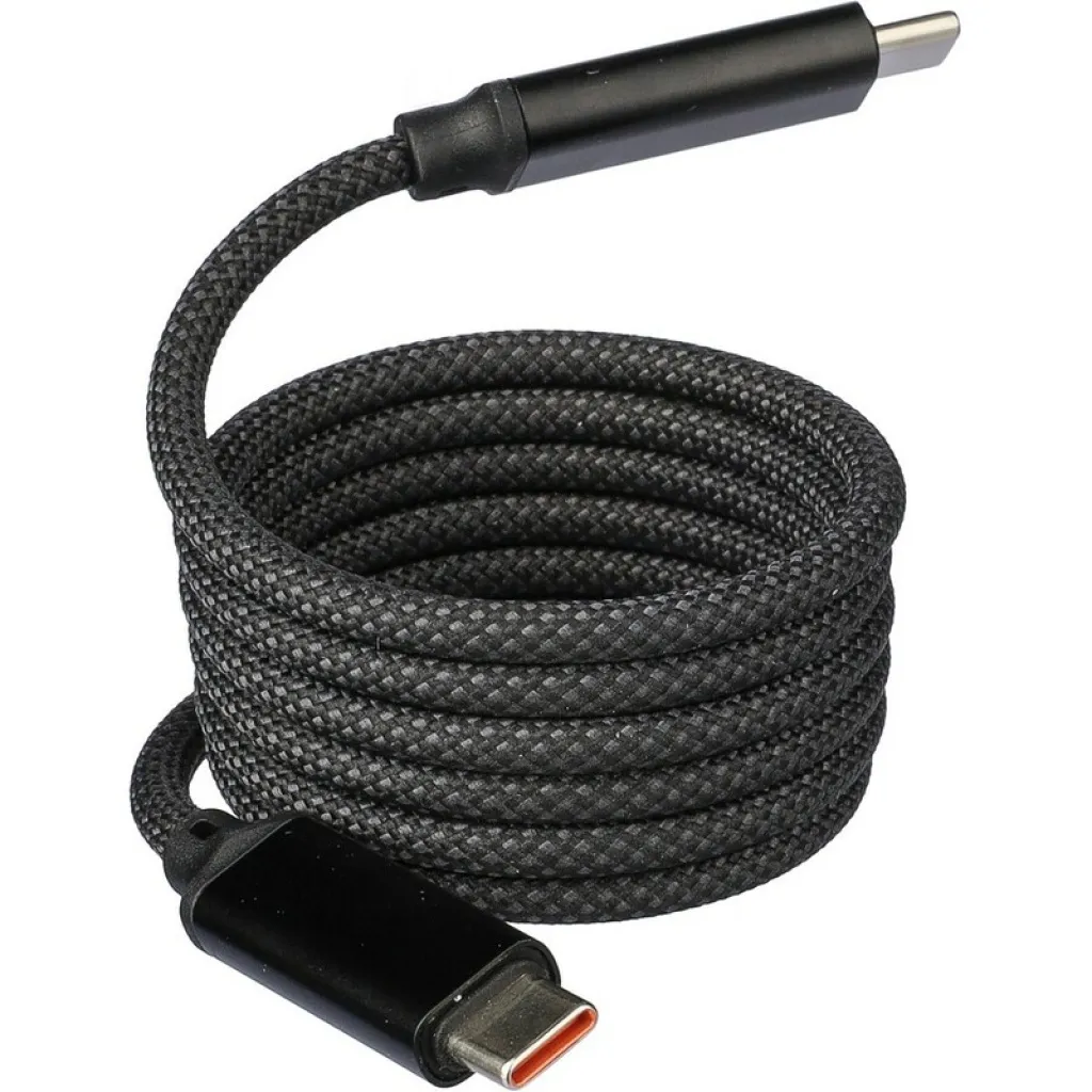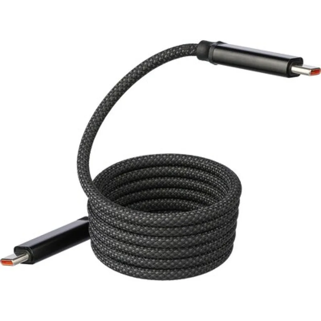 Kabel za prijenos podataka i punjenje s 2 x USB-C utorom. Brzina prijenosa podataka 240 Mb/s. Kabel sadrži magnet zahvaljujući kojem se automatski namota. Izlazna snaga punjenja 60W. Pakirano u smeđu kartonsku kutiju. Proizvod napravljen od najlona i aluminija.