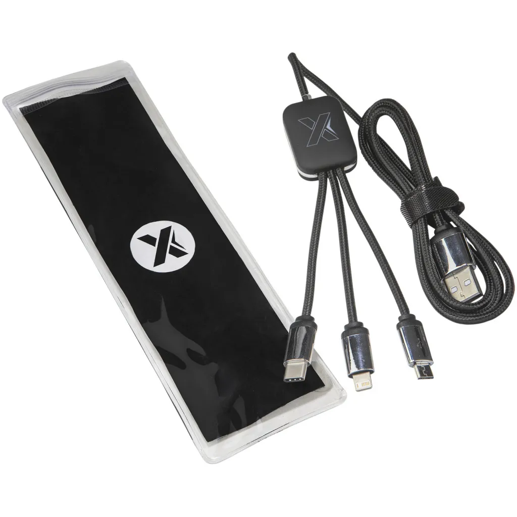 Kabel za punjenje od gume i metala opremljen s osvjetljenim logom, s tri priključka (Type-C, Android, iPhone). Istovremeno se mogu puniti do tri uređaja. Duljina kabela (uključujući utikače): 10 cm. Ukupna duljina kabela: 1 metar. Reciklirani PET plastični kabel i ambalaža izrađeni su od recikliranog papira i reciklirane plastike.