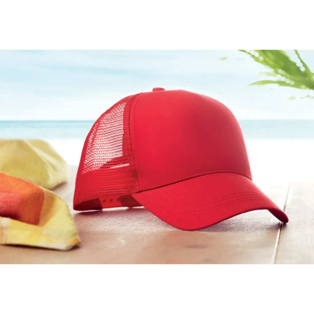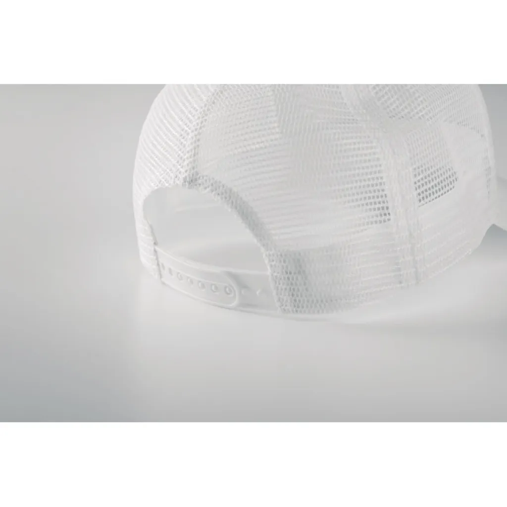 Kapa od poliestera sa šiltom, 5 panela i plastičnom kopčom za podešavanje veličine. Prednji panel u boji sa spužvastom podstavom. Mrežasti paneli straga. Veličina 7 1/4.