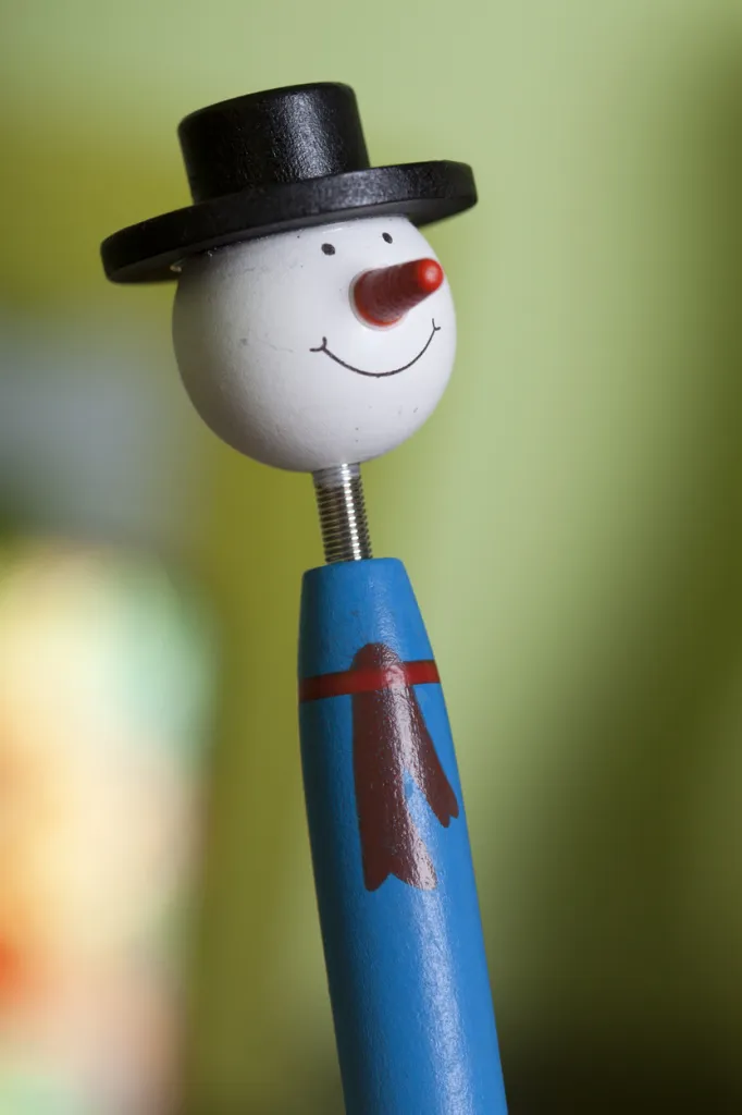 Drvena, kemijska olovka s motivom crtića i božićnom figurom na vrhu. Sa plavim punjenjem.