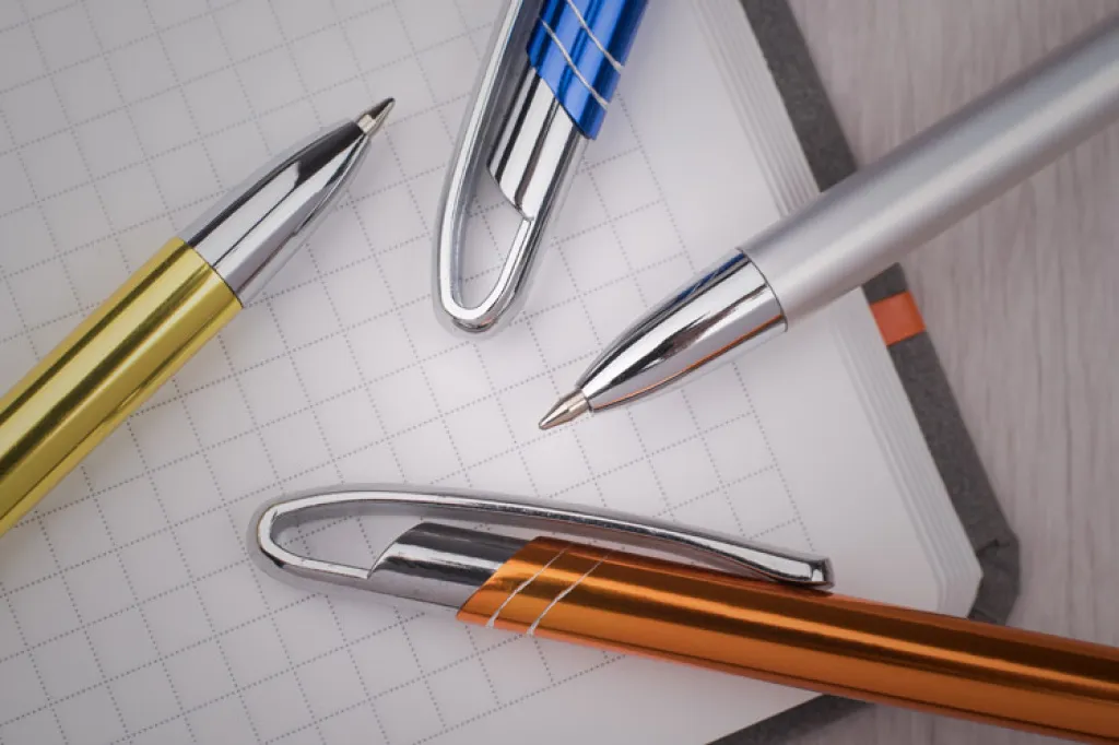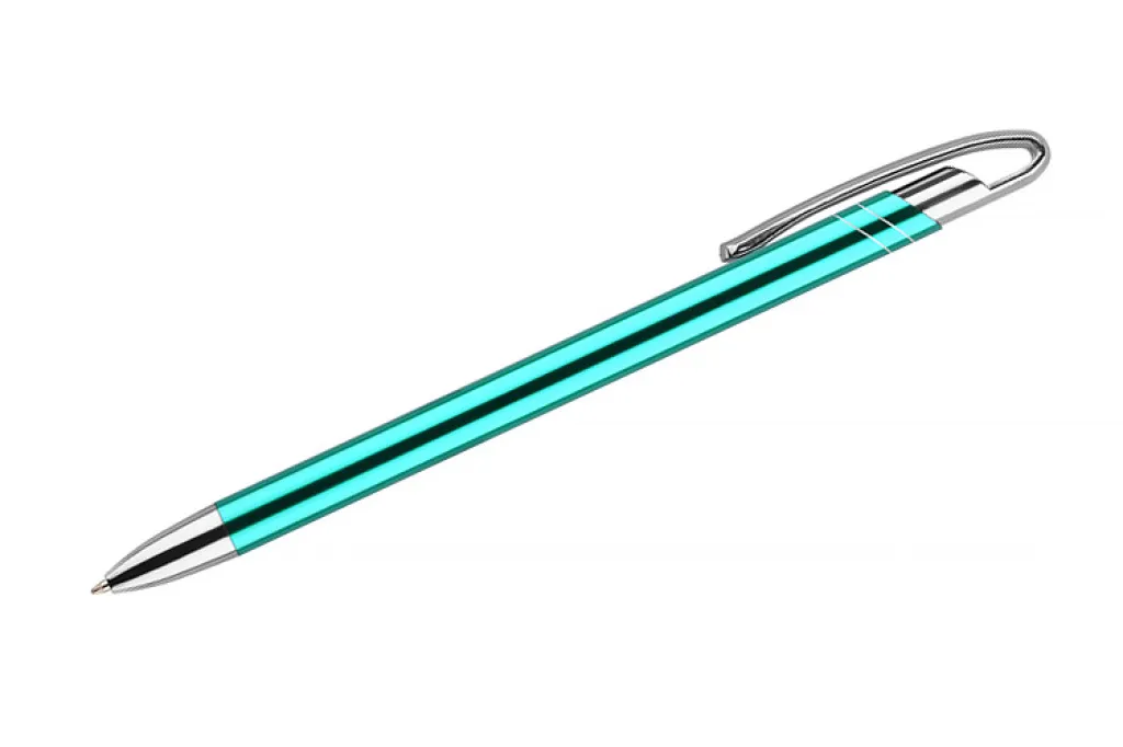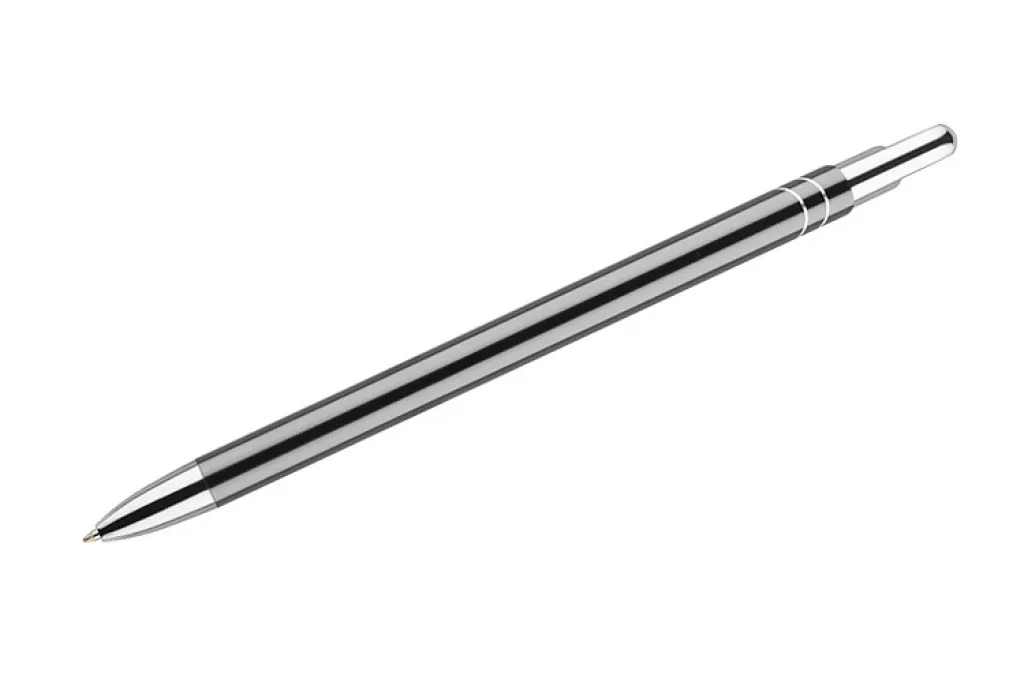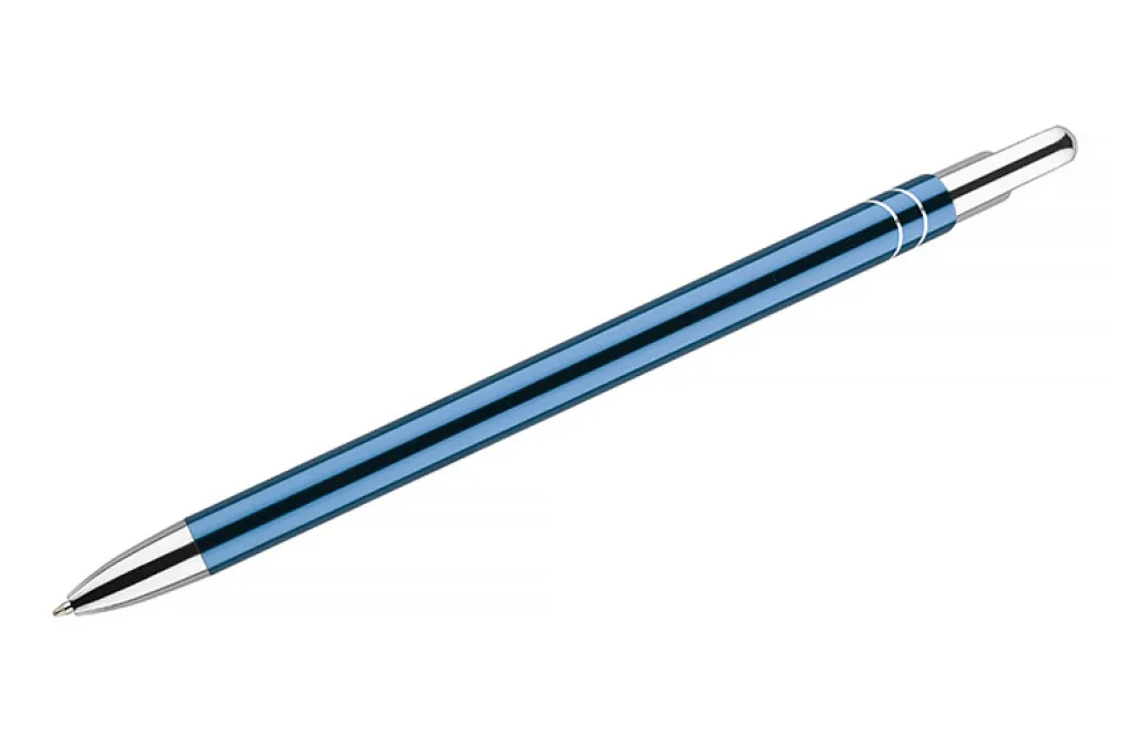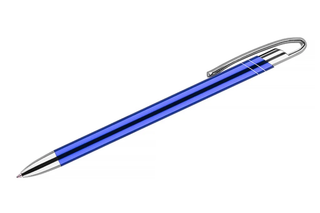 Tanka i uglađena kemijska olovka s metalik završnom obradom. Klipsa i vrh su kromirani. Olovka se ističe originalnim dizajnom klipse. Tijelo je ukrašeno s dvije nakrivljene srebrne trake. Debljina pisanja 0.7mm. Plava tinta.