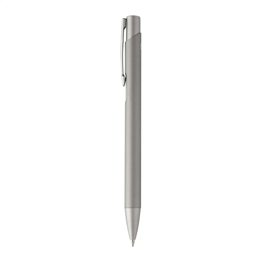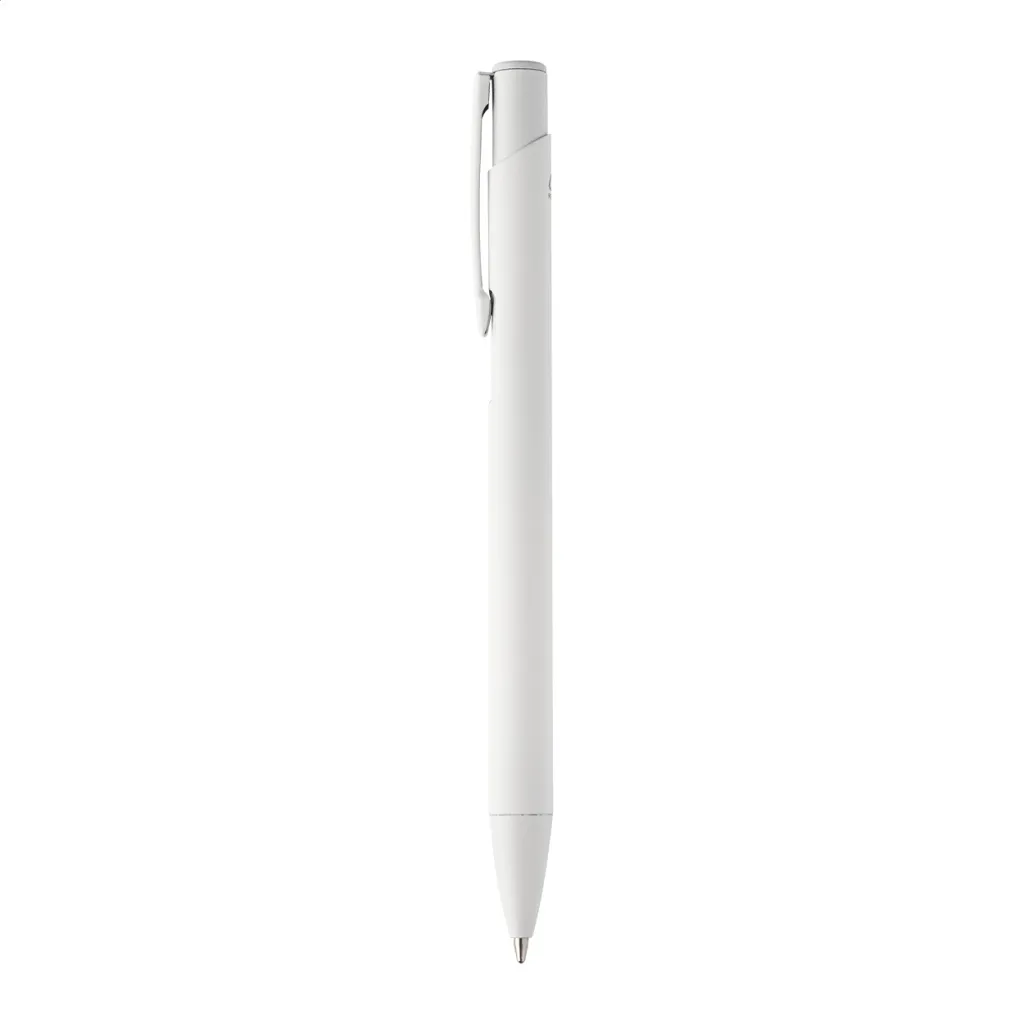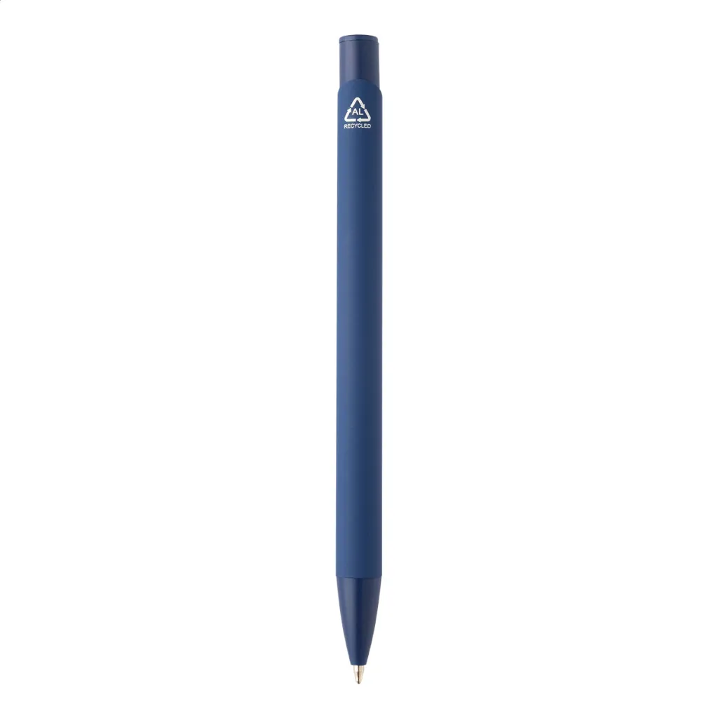 Kemijska olovka od recikliranog aluminija s gumiranom završnom obradom i detaljima u odgovarajućoj boji. S plavim punjenjem.