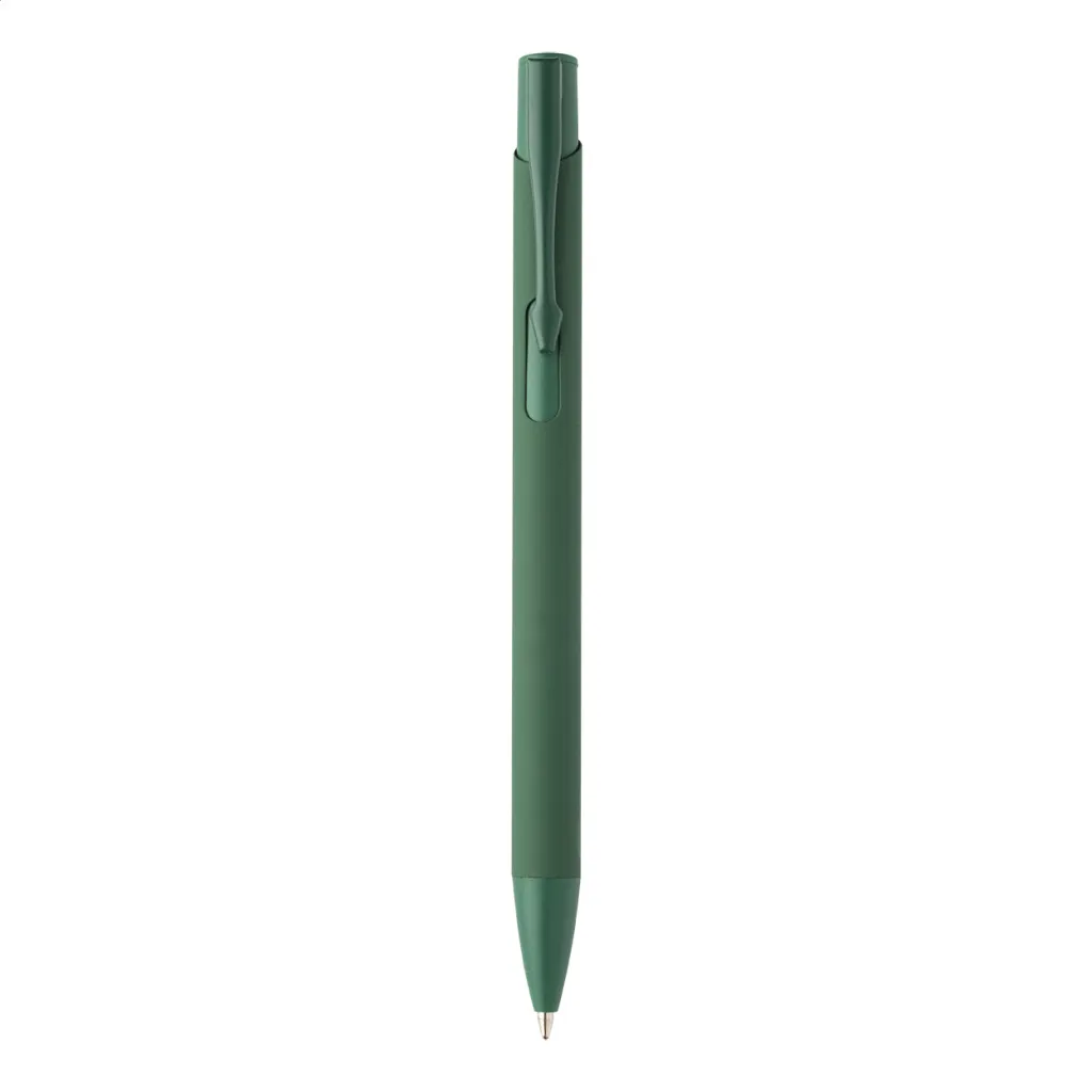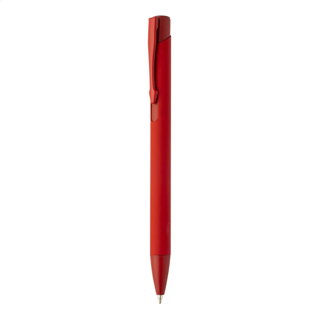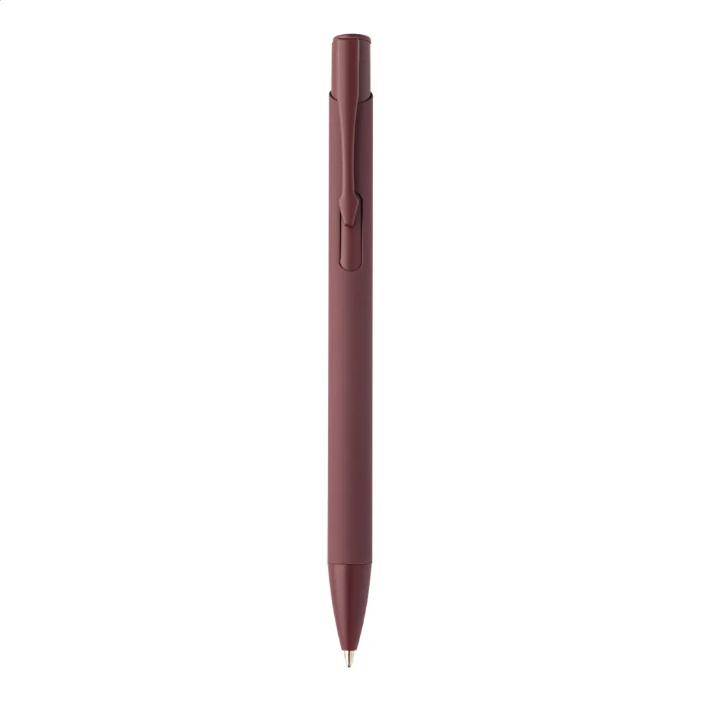 Kemijska olovka od recikliranog aluminija s gumiranom završnom obradom i detaljima u odgovarajućoj boji. S plavim punjenjem.