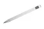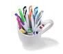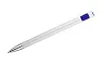Jednostavna bijela plastična kemijska olovka s dekorativnom raznobojnom klipsom i prostorom oko pušera. Plava tinta.