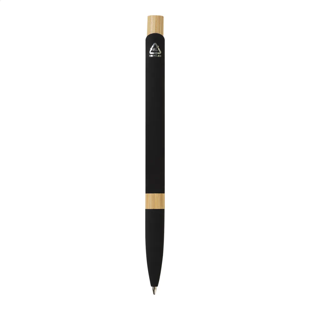 Poklon set od 2 dijela u poklon kutiji od kraft papira. Uključuje recikliranu aluminijsku kemijsku olovku s detaljima od bambusa, gumiranom završnom obradom i plavim punjenjem i privjesak za ključeve od bambusa s gumiranom završnom obradom od recikliranog nehrđajućeg čelika. Oba predmeta imaju poseban premaz za zrcalno lasersko graviranje.