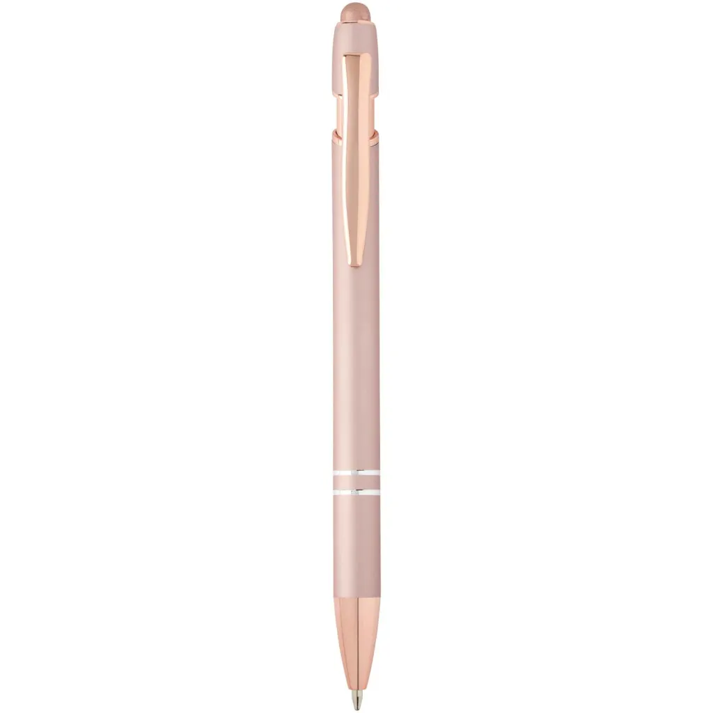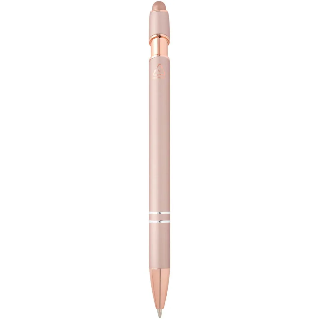 Nanna kemijska olovka sa završnom obradom boje ružučastog zlata ima kućište izrađeno od recikliranog aluminija sa silikonskim touch vrhom. Reciklirani aluminij smanjuje količinu otpada na odlagalištima i pomaže u očuvanju prirodnih resursa s ciljem smanjenja emisija stakleničkih plinova. Boja tinte: plava. Dužina pisanja: 800 metara. Veličina vrha za pisanje: 1,0 mm.