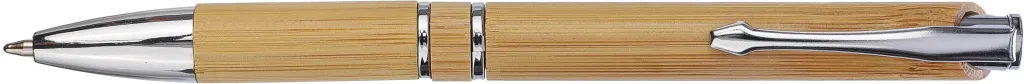 Kemijska olovka od bambusa s kromiranim metalnim detaljima i pritisnim gumbom. Prstenovi, pritisni gumb i vrh od plastike, metalna kopča. Okvirno 800 metara duljine zapisa. Crna tinta.