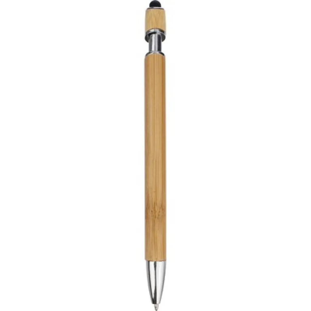Kemijska olovka s touch vrhom i kromiranim metalnim detaljima, vrh olovke omogućava rad sa ekranom osjetljivim na dodir, klipsa za jednostavno kačenje na džep ili korice za bilježnicu, piše plavom bojom, duljina pisanja cca. 800 m, proizvod od bambusa, plastike i metala.